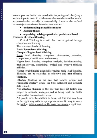 %u062c%u0645%u064a%u0639 %u0627%u0644%u062d%u0642%u0648%u0642 %u0645%u062d%u0641%u0648%u0638%u0629 %u0640 %u0627%u0625%u0644%u0639%u062a%u062f%u0627%u0621 %u0639%u0649%u0644 %u062d%u0642 %u0627%u0645%u0644%u0624%u0644%u0641 %u0628%u0627%u0644%u0646%u0633%u062e %u0623%u0648 %u0627%u0644%u0637%u0628%u0627%u0639%u0629 %u064a%u0639%u0631%u0636 %u0641%u0627%u0639%u0644%u0647 %u0644%u0644%u0645%u0633%u0627%u0626%u0644%u0629 %u0627%u0644%u0642%u0627%u0646%u0648%u0646%u064a%u062912mental process that is concerned with inspecting and clarifying a certain topic in order to reach reasonable conclusions that can be expressed either verbally or non-verbally. It can be also defined as an objective-oriented behavior that aims to: %uf0b7 understanding a specific situation%uf0b7 Judging things%uf0b7 organizing solving a particular problem at handFeatures of critical thinkingCritical Thinking is a skill that can be gained through education and training.There are two levels of thinking: Basic/ lower-level thinkingComplex/ higher level thinkingBasic level thinking comprises observation, attention, comparison, classification and memory.Higher level thinking comprises analysis, decision-making, problem-solving, organizing, critical and creative thinking abilities.Higher level thinking essentially requires basic level thinking.Thinking can be classified as effective and non-effective thinking.Effective thinking is the one that follows proper and reasonable strategy where the best sufficient and accuratedata is used.Non-effective thinking is the one that does not follow any proper or accurate strategies and is being built on faulty reasons that does not make sense. All people have the abilities to think, but few who can think in the right way with an appropriate scientific way to reach the truth or solve a problem Or make decision in a right way.