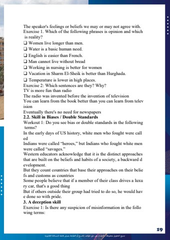 %u062c%u0645%u064a%u0639 %u0627%u0644%u062d%u0642%u0648%u0642 %u0645%u062d%u0641%u0648%u0638%u0629 %u0640 %u0627%u0625%u0644%u0639%u062a%u062f%u0627%u0621 %u0639%u0649%u0644 %u062d%u0642 %u0627%u0645%u0644%u0624%u0644%u0641 %u0628%u0627%u0644%u0646%u0633%u062e %u0623%u0648 %u0627%u0644%u0637%u0628%u0627%u0639%u0629 %u064a%u0639%u0631%u0636 %u0641%u0627%u0639%u0644%u0647 %u0644%u0644%u0645%u0633%u0627%u0626%u0644%u0629 %u0627%u0644%u0642%u0627%u0646%u0648%u0646%u064a%u062919The speaker's feelings or beliefs we may or may not agree with.Exercise 1. Which of the following phrases is opinion and whichis reality?%u2751 Women live longer than men.%u2751 Water is a basic human need.%u2751 English is easier than French.%u2751 Man cannot live without bread%u2751 Working in nursing is better for women%u2751 Vacation in Sharm El-Sheik is better than Hurghada.%u2751 Temperature is lower in high places.Exercise 2: Which sentences are they? Why?TV is more fun than radioThe radio was invented before the invention of televisionYou can learn from the book better than you can learn from televisionEventually there's no need for newspapers2.2. Skill in Biases / Double StandardsWorkout 1: Do you see bias or double standards in the followingterms?In the early days of US history, white men who fought were calledIndians were called %u2015heroes,%u2016 but Indians who fought white menwere called %u2015savages.%u2016Western educators acknowledge that it is the distinct approachesthat are built on the beliefs and habits of a society, a backward development.But they count countries that base their approaches on their beliefs and customs as countriesSome people believe that if a member of their class drives a luxury car, that's a good thingBut if others outside their group had tried to do so, he would have done so with pride.3. A deception skillExercise 1: Is there any suspicion of misinformation in the following terms: