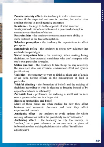 %u062c%u0645%u064a%u0639 %u0627%u0644%u062d%u0642%u0648%u0642 %u0645%u062d%u0641%u0648%u0638%u0629 %u0640 %u0627%u0625%u0644%u0639%u062a%u062f%u0627%u0621 %u0639%u0649%u0644 %u062d%u0642 %u0627%u0645%u0644%u0624%u0644%u0641 %u0628%u0627%u0644%u0646%u0633%u062e %u0623%u0648 %u0627%u0644%u0637%u0628%u0627%u0639%u0629 %u064a%u0639%u0631%u0636 %u0641%u0627%u0639%u0644%u0647 %u0644%u0644%u0645%u0633%u0627%u0626%u0644%u0629 %u0627%u0644%u0642%u0627%u0646%u0648%u0646%u064a%u062929Pseudo certainty effect - the tendency to make risk-aversechoices if the expected outcome is positive, but make riskseeking choices to avoid negative outcomes.Reactance - the urge to do the opposite of what someonewants you to do out of a need to resist a perceived attempt toconstrain your freedom of choice.Restraint bias - the tendency to overestimate one's ability toshow restraint in the face of temptation.Selective perception - the tendency for expectations to affect perception.Semmelweis reflex - the tendency to reject new evidence that contradicts a paradigm.Social comparison bias - the tendency, when making hiring decisions, to favor potential candidates who don't compete with one's own particular strengths.Status quo bias - the tendency to like things to stay relatively the same (see also loss aversion, endowment effect and system justification).Unit bias - the tendency to want to finish a given unit of a task or an item. Strong effects on the consumption of food in particular.Wishful thinking - the formation of beliefs and the making of decisions according to what is pleasing to imagine instead of by appeal to evidence or rationality.Zero-risk bias - preference for reducing a small risk to zero over a greater reduction in a larger risk.Biases in probability and beliefMany of these biases are often studied for how they affect business and economic decisions and how they affect experimental research.Ambiguity effect - the tendency to avoid options for which missing information makes the probability seem \Anchoring effect %u2013 the tendency to rely too heavily, or \,\ on a past reference or on one trait or piece of information when making decisions (also called \adjustment\