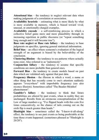 %u062c%u0645%u064a%u0639 %u0627%u0644%u062d%u0642%u0648%u0642 %u0645%u062d%u0641%u0648%u0638%u0629 %u0640 %u0627%u0625%u0644%u0639%u062a%u062f%u0627%u0621 %u0639%u0649%u0644 %u062d%u0642 %u0627%u0645%u0644%u0624%u0644%u0641 %u0628%u0627%u0644%u0646%u0633%u062e %u0623%u0648 %u0627%u0644%u0637%u0628%u0627%u0639%u0629 %u064a%u0639%u0631%u0636 %u0641%u0627%u0639%u0644%u0647 %u0644%u0644%u0645%u0633%u0627%u0626%u0644%u0629 %u0627%u0644%u0642%u0627%u0646%u0648%u0646%u064a%u062930Attentional bias %u2013 the tendency to neglect relevant data when making judgments of a correlation or association.Availability heuristic %u2013 estimating what is more likely by what is more available in memory, which is biased toward vivid, unusual, or emotionally charged examples.Availability cascade %u2013 a self-reinforcing process in which a collective belief gains more and more plausibility through its increasing repetition in public discourse (or \long enough and it will become true\Base rate neglect or Base rate fallacy %u2013 the tendency to base judgments on specifics, ignoring general statistical information.Belief bias %u2013 an effect where someone's evaluation of the logical strength of an argument is biased by the believability of the conclusion.Clustering illusion %u2013 the tendency to see patterns where actually none exist. Also referred to as \Conjunction fallacy %u2013 the tendency to assume that specific conditions are more probable than general ones.Forward Bias - the tendency to create models based on past data which are validated only against that past data.Frequency illusion - the illusion in which a word, a name or other thing that has recently come to one's attention suddenly appears \improbable frequency (see also recency illusion). Sometimes called \phenomenon\Gambler%u2019s fallacy - the tendency to think that future probabilities are altered by past events, when in reality they are unchanged. Results from an erroneous conceptualization of the Law of large numbers e.g. \times consecutively, so the chance of tails coming out on the sixth flip is much greater than heads.\Hindsight bias - sometimes called the \effect, the tendency to see past events as being predictable at the time those events happened. (sometimes phrased as \20/20\