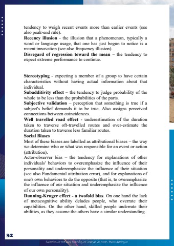 %u062c%u0645%u064a%u0639 %u0627%u0644%u062d%u0642%u0648%u0642 %u0645%u062d%u0641%u0648%u0638%u0629 %u0640 %u0627%u0625%u0644%u0639%u062a%u062f%u0627%u0621 %u0639%u0649%u0644 %u062d%u0642 %u0627%u0645%u0644%u0624%u0644%u0641 %u0628%u0627%u0644%u0646%u0633%u062e %u0623%u0648 %u0627%u0644%u0637%u0628%u0627%u0639%u0629 %u064a%u0639%u0631%u0636 %u0641%u0627%u0639%u0644%u0647 %u0644%u0644%u0645%u0633%u0627%u0626%u0644%u0629 %u0627%u0644%u0642%u0627%u0646%u0648%u0646%u064a%u062932tendency to weigh recent events more than earlier events (see also peak-end rule).Recency illusion - the illusion that a phenomenon, typically a word or language usage, that one has just begun to notice is a recent innovation (see also frequency illusion).Disregard of regression toward the mean %u2013 the tendency to expect extreme performance to continue.Stereotyping - expecting a member of a group to have certain characteristics without having actual information about that individual.Subadditivity effect %u2013 the tendency to judge probability of the whole to be less than the probabilities of the parts.Subjective validation %u2013 perception that something is true if a subject's belief demands it to be true. Also assigns perceived connections between coincidences.Well travelled road effect - underestimation of the duration taken to traverse oft-travelled routes and over-estimate the duration taken to traverse less familiar routes.Social BiasesMost of these biases are labelled as attributional biases %u2013 the way we determine who or what was responsible for an event or action (attribution).Actor-observer bias %u2013 the tendency for explanations of other individuals' behaviors to overemphasize the influence of their personality and underemphasize the influence of their situation (see also Fundamental attribution error), and for explanations of one's own behaviors to do the opposite (that is, to overemphasizethe influence of our situation and underemphasize the influence of our own personality).Dunning-Kruger effect - a twofold bias. On one hand the lack of metacognitive ability deludes people, who overrate their capabilities. On the other hand, skilled people underrate their abilities, as they assume the others have a similar understanding.