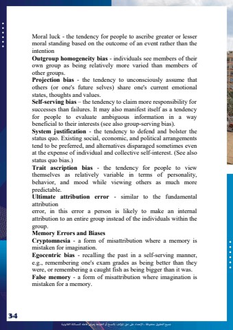 %u062c%u0645%u064a%u0639 %u0627%u0644%u062d%u0642%u0648%u0642 %u0645%u062d%u0641%u0648%u0638%u0629 %u0640 %u0627%u0625%u0644%u0639%u062a%u062f%u0627%u0621 %u0639%u0649%u0644 %u062d%u0642 %u0627%u0645%u0644%u0624%u0644%u0641 %u0628%u0627%u0644%u0646%u0633%u062e %u0623%u0648 %u0627%u0644%u0637%u0628%u0627%u0639%u0629 %u064a%u0639%u0631%u0636 %u0641%u0627%u0639%u0644%u0647 %u0644%u0644%u0645%u0633%u0627%u0626%u0644%u0629 %u0627%u0644%u0642%u0627%u0646%u0648%u0646%u064a%u062934Moral luck - the tendency for people to ascribe greater or lesser moral standing based on the outcome of an event rather than the intentionOutgroup homogeneity bias - individuals see members of their own group as being relatively more varied than members of other groups.Projection bias - the tendency to unconsciously assume that others (or one's future selves) share one's current emotional states, thoughts and values.Self-serving bias %u2013 the tendency to claim more responsibility forsuccesses than failures. It may also manifest itself as a tendency for people to evaluate ambiguous information in a way beneficial to their interests (see also group-serving bias).System justification - the tendency to defend and bolster the status quo. Existing social, economic, and political arrangements tend to be preferred, and alternatives disparaged sometimes even at the expense of individual and collective self-interest. (See also status quo bias.)Trait ascription bias - the tendency for people to view themselves as relatively variable in terms of personality, behavior, and mood while viewing others as much more predictable.Ultimate attribution error - similar to the fundamental attributionerror, in this error a person is likely to make an internal attribution to an entire group instead of the individuals within the group.Memory Errors and BiasesCryptomnesia - a form of misattribution where a memory is mistaken for imagination.Egocentric bias - recalling the past in a self-serving manner, e.g., remembering one's exam grades as being better than they were, or remembering a caught fish as being bigger than it was.False memory - a form of misattribution where imagination is mistaken for a memory.
