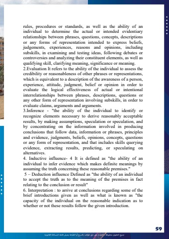 %u062c%u0645%u064a%u0639 %u0627%u0644%u062d%u0642%u0648%u0642 %u0645%u062d%u0641%u0648%u0638%u0629 %u0640 %u0627%u0625%u0644%u0639%u062a%u062f%u0627%u0621 %u0639%u0649%u0644 %u062d%u0642 %u0627%u0645%u0644%u0624%u0644%u0641 %u0628%u0627%u0644%u0646%u0633%u062e %u0623%u0648 %u0627%u0644%u0637%u0628%u0627%u0639%u0629 %u064a%u0639%u0631%u0636 %u0641%u0627%u0639%u0644%u0647 %u0644%u0644%u0645%u0633%u0627%u0626%u0644%u0629 %u0627%u0644%u0642%u0627%u0646%u0648%u0646%u064a%u062959rules, procedures or standards, as well as the ability of an individual to determine the actual or intended evidentiary relationships between phrases, questions, concepts, descriptions or any forms of representation intended to express beliefs, judgements, experiences, reasons and opinions, including subskills, in examining and testing ideas, following debates or controversies and analyzing their constituent elements, as well as qualifying skill, clarifying meaning, significance or meaning. 2.Evaluation It refers to the ability of the individual to assess the credibility or reasonableness of other phrases or representations, which is equivalent to a description of the awareness of a person, experience, attitude, judgment, belief or opinion in order to evaluate the logical effectiveness of actual or intentional interrelationships between phrases, descriptions, questions or any other form of representation involving subskills, in order to evaluate claims, arguments and arguments. 3.Inference - \recognize elements necessary to derive reasonably acceptable results, by making assumptions, speculation or speculation, and by concentrating on the information involved in producing conclusions that follow data, information or phrases, principles and evidence, judgments, beliefs, opinions, concepts, questions or any form of representation, and that includes skills querying evidence, extracting results, predicting, or speculating on alternatives.4. Inductive influence- 4 It is defined as \individual to infer evidence which makes definite meanings by assuming the truth concerning these reasonable premises.\5 %u2013 Deduction influence Defined as \to accept the truth as to the meaning of the premises in fact relating to the conclusion or result\6. Interpretation : to arrive at conclusions regarding some of the brief introductions given as well as what is known as \capacity of the individual on the reasonable indication as to whether or not these results follow the given introduction.