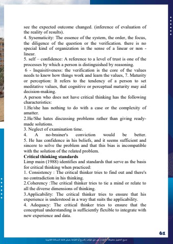 %u062c%u0645%u064a%u0639 %u0627%u0644%u062d%u0642%u0648%u0642 %u0645%u062d%u0641%u0648%u0638%u0629 %u0640 %u0627%u0625%u0644%u0639%u062a%u062f%u0627%u0621 %u0639%u0649%u0644 %u062d%u0642 %u0627%u0645%u0644%u0624%u0644%u0641 %u0628%u0627%u0644%u0646%u0633%u062e %u0623%u0648 %u0627%u0644%u0637%u0628%u0627%u0639%u0629 %u064a%u0639%u0631%u0636 %u0641%u0627%u0639%u0644%u0647 %u0644%u0644%u0645%u0633%u0627%u0626%u0644%u0629 %u0627%u0644%u0642%u0627%u0646%u0648%u0646%u064a%u062961see the expected outcome changed. (inference of evaluation of the reality of results). 4. Sysematicity: The essence of the system, the order, the focus, the diligence of the question or the verification. there is no special kind of organization in the sense of a linear or non -linear. 5. self %u2013 confidence: A reference to a level of trust is one of the processes by which a person is distinguished by reasoning.6 - Inquisitiveness: the verification is the core of the values needs to know how things work and learn the values, 7. Maturity or perception: It refers to the tendency of a person to set meditative values, that cognitive or perceptual maturity may aid decision-making.A person who does not have critical thinking has the following characteristics:1.He/she has nothing to do with a case or the complexity of amatter.2.He/She hates discussing problems rather than giving readymade solutions.3. Neglect of examination time.4. A no-brainer's conviction would be better.5. He has confidence in his beliefs, and it seems sufficient and sincere to solve the problem and that this bias is incompatible with the solution of the related problem.Critical thinking standardsLimp main (1988) identifies and standards that serve as the basis for critical thinking when practiced:1. Consistency : The critical thinker tries to find out and there's no contradiction in his thinking.2.Coherency :The critical thinker tries to tie a mind or relate to all the diverse dimensions of thinking.3.Applicability: The critical thinker tries to ensure that his experience is understood in a way that suits the applicability.4. Adequacy: The critical thinker tries to ensure that the conceptual understanding is sufficiently flexible to integrate with new experience and data.
