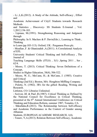 %u062c%u0645%u064a%u0639 %u0627%u0644%u062d%u0642%u0648%u0642 %u0645%u062d%u0641%u0648%u0638%u0629 %u0640 %u0627%u0625%u0644%u0639%u062a%u062f%u0627%u0621 %u0639%u0649%u0644 %u062d%u0642 %u0627%u0645%u0644%u0624%u0644%u0641 %u0628%u0627%u0644%u0646%u0633%u062e %u0623%u0648 %u0627%u0644%u0637%u0628%u0627%u0639%u0629 %u064a%u0639%u0631%u0636 %u0641%u0627%u0639%u0644%u0647 %u0644%u0644%u0645%u0633%u0627%u0626%u0644%u0629 %u0627%u0644%u0642%u0627%u0646%u0648%u0646%u064a%u062971- Li ,L,K.(2012). A Study of the Attitude, Self-efficacy , Effort andAcademic Achievement of CityU Students towards Research Methodsand Statistics , Discovery- SS Students E-Journal , Vol. 1,2012,154-183.- Lipman, M.(1991). Strengthening Reasoning and Judgment throughPhilosophy. In S. Maclure & P. Davis(Eds.) , Learning to Think , Thinkingto Learn (pp.103-113). Oxford, UK : Pergamon Press plc.- Moafian ,F. & Ghanizadeh ,A.(2011). A Correlational Analysis of EFLUniversity Students' Critical Thinking and Self-efficacy , The Journal ofTeaching Language Skills (JTLS) , 3(1) ,Spring 2011 , Ser , 62/4.- Moore, T. (2013). Critical Thinking: Seven Definitions of a Concept,Studies in Higher Education, 38(4), 506-522.- Moore, W, E.; McCann, H.; & McCann, J. (1985). Creative and CriticalThinking (2nd Ed.). Boston, MA: Houghton Miffling Company.- Polette, N. (1982). 3R's for the gifted: Reading, Writing and Research.Littleton, CO: Libraries Unlimited.- Scriven ,M. & Paul ,R.(1987). Critical Thinking as Defined by the National Council for Excellence in Critical Thinking, presented at the 8th Annual International Conference on Critical Thinking and Education Reform, summer 1987, Tomales, CA.- Shkullaku,R.(2013). The Relationship between Self-efficacy and Academic Performance in the Context of Gender among AlbanianStudents, EUROPEAN ACADEMIC RESEARCH, 1(4).- Tenaw, Y,A.(2013). Relation Between Self-efficacy, Academic