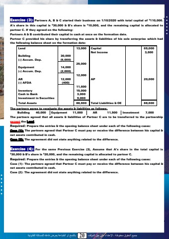 %u062c%u0645%u064a%u0639 %u0627%u0644%u062d%u0642%u0648%u0642 %u0645%u062d%u0641%u0648%u0638%u0629 %u0640 %u0627%u0625%u0644%u0639%u062a%u062f%u0627%u0621 %u0639%u0644%u0649 %u062d%u0642 %u0627%u0644%u0645%u0624%u0644%u0641 20 %u0628%u0627%u0644%u0646%u0633%u062e %u0623%u0648 %u0627%u0644%u0637%u0628%u0627%u0639%u0629 %u064a%u0639%u0631%u0636 %u0641%u0627%u0639%u0644%u0647 %u0644%u0644%u0645%u0633%u0627%u0626%u0644%u0629 %u0627%u0644%u0642%u0627%u0646%u0648%u0646%u064a%u0629Exercise (3): Partners A, B & C started their business on 1/10/2020 with total capital of $110,000. A%u2019s share in this capital is $30,000 & B%u2019s share is $10,000, and the remaining capital is allocated to partner C. If they agreed on the following:Partners A & B contributed their capital in cash at once on the formation date.Partner C provided his share by transferring the assets & liabilities of his sole enterprise which had the following balance sheet on the formation date:Land 13,000 Capital 65,000Net Income 3,600Building 30,000(-) Accum. Dep. (5,000)25,000Equipment 14,000(-) Accum. Dep. (2,000)12,000AR 12,000 AP 20,000(-) AFDA (400)11,600Inventory 15,000Cash in Bank 3,000Investment in Securities 9,000Total Assets 88,600 Total Liabilities & OE 88,600The partners agree to revaluate the assets & liabilities as follows:Building 40,000 Equipment 11,000 AR 11,500 Investment 7,000The partners agreed that all assets & liabilities of Partner C are to be transferred to the partnership except the Land.Required: Prepare the entries & the opening balance sheet under each of the following cases:Case (1): The partners agreed that Partner C must pay or receive the difference between his capital & net assets contributed in cash.Case (2): The agreement did not state anything related to the difference. Exercise (4): For the same Previous Exercise (3), Assume that A%u2019s share in the total capital is $30,000 & B%u2019s share is $20,000, and the remaining capital is allocated to partner C.Required: Prepare the entries & the opening balance sheet under each of the following cases:Case (1): The partners agreed that Partner C must pay or receive the difference between his capital & net assets contributed in cash.Case (2): The agreement did not state anything related to the difference.18