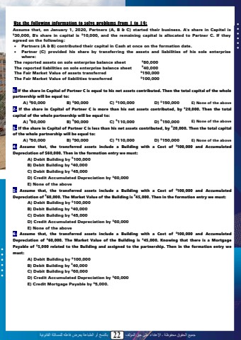 %u062c%u0645%u064a%u0639 %u0627%u0644%u062d%u0642%u0648%u0642 %u0645%u062d%u0641%u0648%u0638%u0629 %u0640 %u0627%u0625%u0644%u0639%u062a%u062f%u0627%u0621 %u0639%u0644%u0649 %u062d%u0642 %u0627%u0644%u0645%u0624%u0644%u0641 22 %u0628%u0627%u0644%u0646%u0633%u062e %u0623%u0648 %u0627%u0644%u0637%u0628%u0627%u0639%u0629 %u064a%u0639%u0631%u0636 %u0641%u0627%u0639%u0644%u0647 %u0644%u0644%u0645%u0633%u0627%u0626%u0644%u0629 %u0627%u0644%u0642%u0627%u0646%u0648%u0646%u064a%u0629Use the following information to solve problems from 1 to 14:Assume that, on January 1, 2020, Partners (A, B & C) started their business. A's share in Capital is $30,000, B's share in capital is $10,000, and the remaining capital is allocated to Partner C. If they agreed on the following:%u2022 Partners (A & B) contributed their capital in Cash at once on the formation date.%u2022 Partner (C) provided his share by transferring the assets and liabilities of his sole enterprise where:The reported assets on sole enterprise balance sheet $80,000The reported liabilities on sole enterprise balance sheet $40,000The Fair Market Value of assets transferred $150,000The Fair Market Value of liabilities transferred $100,0001- If the share in Capital of Partner C is equal to his net assets contributed. Then the total capital of the whole partnership will be equal to: A) $50,000 B) $90,000 C) $100,000 D) $150,000 E) None of the above2- If the share in Capital of Partner C is more than his net assets contributed, by $20,000. Then the total capital of the whole partnership will be equal to: A) $50,000 B) $90,000 C) $110,000 D) $150,000 E) None of the above3- If the share in Capital of Partner C is less than his net assets contributed, by $20,000. Then the total capital of the whole partnership will be equal to: A) $50,000 B) $90,000 C) $110,000 D) $150,000 E) None of the above4- Assume that, the transferred assets include a Building with a Cost of $100,000 and Accumulated Depreciation of $60,000. Then in the formation entry we must:A) Debit Building by $100,000B) Debit Building by $40,000C) Debit Building by $45,000D) Credit Accumulated Depreciation by $60,000E) None of the above5- Assume that, the transferred assets include a Building with a Cost of $100,000 and Accumulated Depreciation of $60,000. The Market Value of the Building is $45,000. Then in the formation entry we must:A) Debit Building by $100,000B) Debit Building by $40,000C) Debit Building by $45,000D) Credit Accumulated Depreciation by $60,000E) None of the above6- Assume that, the transferred assets include a Building with a Cost of $100,000 and Accumulated Depreciation of $60,000. The Market Value of the Building is $45,000. Knowing that there is a Mortgage Payable of $5,000 related to the Building and assigned to the partnership. Then in the formation entry we must: A) Debit Building by $100,000B) Debit Building by $40,000C) Debit Building by $60,000D) Credit Accumulated Depreciation by $60,000E) Credit Mortgage Payable by $5,000. 20