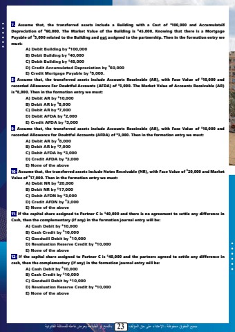 %u062c%u0645%u064a%u0639 %u0627%u0644%u062d%u0642%u0648%u0642 %u0645%u062d%u0641%u0648%u0638%u0629 %u0640 %u0627%u0625%u0644%u0639%u062a%u062f%u0627%u0621 %u0639%u0644%u0649 %u062d%u0642 %u0627%u0644%u0645%u0624%u0644%u0641 23 %u0628%u0627%u0644%u0646%u0633%u062e %u0623%u0648 %u0627%u0644%u0637%u0628%u0627%u0639%u0629 %u064a%u0639%u0631%u0636 %u0641%u0627%u0639%u0644%u0647 %u0644%u0644%u0645%u0633%u0627%u0626%u0644%u0629 %u0627%u0644%u0642%u0627%u0646%u0648%u0646%u064a%u06297- Assume that, the transferred assets include a Building with a Cost of $100,000 and Accumulated Depreciation of $60,000. The Market Value of the Building is $45,000. Knowing that there is a Mortgage Payable of $5,000 related to the Building and not assigned to the partnership. Then in the formation entry we must: A) Debit Building by $100,000B) Debit Building by $40,000C) Debit Building by $45,000D) Credit Accumulated Depreciation by $60,000E) Credit Mortgage Payable by $5,000. 8- Assume that, the transferred assets include Accounts Receivable (AR), with Face Value of $10,000 and recorded Allowance For Doubtful Accounts (AFDA) of $3,000. The Market Value of Accounts Receivable (AR) is $8,000. Then in the formation entry we must: A) Debit AR by $10,000B) Debit AR by $8,000C) Debit AR by $7,000D) Debit AFDA by $2,000E) Credit AFDA by $3,0009- Assume that, the transferred assets include Accounts Receivable (AR), with Face Value of $10,000 and recorded Allowance for Doubtful Accounts (AFDA) of $3,000. Then in the formation entry we must: A) Debit AR by $8,000B) Debit AR by $7,000C) Debit AFDA by $3,000D) Credit AFDA by $3,000E) None of the above10- Assume that, the transferred assets include Notes Receivable (NR), with Face Value of $20,000 and Market Value of $17,000. Then in the formation entry we must:A) Debit NR by $20,000B) Debit NR by $17,000C) Debit AFDN by $3,000D) Credit AFDN by $3,000E) None of the above11- If the capital share assigned to Partner C is $40,000 and there is no agreement to settle any difference in Cash, then the complementary (if any) in the formation journal entry will be:A) Cash Debit by $10,000B) Cash Credit by $10,000C) Goodwill Debit by $10,000D) Revaluation Reserve Credit by $10,000E) None of the above12- If the capital share assigned to Partner C is $40,000 and the partners agreed to settle any difference in cash, then the complementary (if any) in the formation journal entry will be:A) Cash Debit by $10,000B) Cash Credit by $10,000C) Goodwill Debit by $10,000D) Revaluation Reserve Credit by $10,000E) None of the above 21