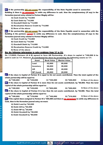 %u062c%u0645%u064a%u0639 %u0627%u0644%u062d%u0642%u0648%u0642 %u0645%u062d%u0641%u0648%u0638%u0629 %u0640 %u0627%u0625%u0644%u0639%u062a%u062f%u0627%u0621 %u0639%u0644%u0649 %u062d%u0642 %u0627%u0644%u0645%u0624%u0644%u0641 26 %u0628%u0627%u0644%u0646%u0633%u062e %u0623%u0648 %u0627%u0644%u0637%u0628%u0627%u0639%u0629 %u064a%u0639%u0631%u0636 %u0641%u0627%u0639%u0644%u0647 %u0644%u0644%u0645%u0633%u0627%u0626%u0644%u0629 %u0627%u0644%u0642%u0627%u0646%u0648%u0646%u064a%u062925- If the partnership did not accept the responsibility of the Note Payable owed in connection with the Building & there is no agreement to settle any difference in cash. then the complementary (if any) in the formation journal entry related to Partner Magdy will be:A) Cash Credit by $14,000B) Cash Debit by $14,000C) Goodwill Debit by $14,000D) Revaluation Reserve Credit by $14,000E) None of the above26- If the partnership did not accept the responsibility of the Note Payable owed in connection with the Building & the partners agreed to settle any difference in cash. then the complementary (if any) in the formation journal entry related to Partner Magdy will be:A) Cash Credit by $14,000B) Cash Debit by $14,000C) Goodwill Debit by $14,000D) Revaluation Reserve Credit by $14,000E) None of the aboveUse the following information to solve problems from 27 to 33:On 1/1/2020, Partners (A & B) agreed to form AB Partnership. A%u2019s share in capital is $100,000 & he paid in cash on 1/1. However, B contributed his share by presenting the following assets on 1/1:Asset Book Value Market ValueLand 42,000 65,000Inventory 38,000 35,000AR 50,000 40,000NP (Land) 25,000 20,00027- If the share in Capital of Partner B is equal to his net assets contributed. Then the total capital of the whole partnership will be equal to: A) $100,000 B) $120,000 C) $160,000 D) $220,000 E) None of the above28- If the share in Capital of Partner B is more than his net assets contributed, by $60,000. Then the total capital of the whole partnership will be equal to: A) $100,000 B) $120,000 C) $300,000 D) $320,000 E) None of the above29- If the share in Capital of Partner B is less than his net assets contributed, by $50,000. Then the total capital of the whole partnership will be equal to: A) $100,000 B) $170,000 C) $160,000 D) $210,000 E) None of the above30- If the capital share assigned to Partner B is $200,000 and there is no agreement to settle any difference in Cash, then in the formation journal entry we must: A) Debit Land by $42,000B) Debit AR by $40,000C) Debit NP by $20,000D) Debit Goodwill by $40,000E) Debit Goodwill by $80,00024