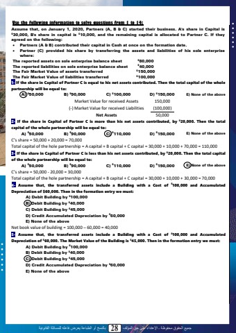 %u062c%u0645%u064a%u0639 %u0627%u0644%u062d%u0642%u0648%u0642 %u0645%u062d%u0641%u0648%u0638%u0629 %u0640 %u0627%u0625%u0644%u0639%u062a%u062f%u0627%u0621 %u0639%u0644%u0649 %u062d%u0642 %u0627%u0644%u0645%u0624%u0644%u0641 28 %u0628%u0627%u0644%u0646%u0633%u062e %u0623%u0648 %u0627%u0644%u0637%u0628%u0627%u0639%u0629 %u064a%u0639%u0631%u0636 %u0641%u0627%u0639%u0644%u0647 %u0644%u0644%u0645%u0633%u0627%u0626%u0644%u0629 %u0627%u0644%u0642%u0627%u0646%u0648%u0646%u064a%u0629Use the following information to solve questions from 1 to 14:Assume that, on January 1, 2020, Partners (A, B & C) started their business. A's share in Capital is $30,000, B's share in capital is $10,000, and the remaining capital is allocated to Partner C. If they agreed on the following:%u2022 Partners (A & B) contributed their capital in Cash at once on the formation date.%u2022 Partner (C) provided his share by transferring the assets and liabilities of his sole enterprise where:The reported assets on sole enterprise balance sheet $80,000The reported liabilities on sole enterprise balance sheet $40,000The Fair Market Value of assets transferred $150,000The Fair Market Value of liabilities transferred $100,0001- If the share in Capital of Partner C is equal to his net assets contributed. Then the total capital of the whole partnership will be equal to: A) $50,000 B) $90,000 C) $100,000 D) $150,000 E) None of the aboveMarket Value for received Assets 150,000(-) Market Value for received Liabilities (100,000)Net Assets 50,0002- If the share in Capital of Partner C is more than his net assets contributed, by $20,000. Then the total capital of the whole partnership will be equal to: A) $50,000 B) $90,000 C) $110,000 D) $150,000 E) None of the aboveC%u2019s share = 50,000 + 20,000 = 70,000Total capital of the hole partnership = A capital + B capital + C capital = 30,000 + 10,000 + 70,000 = 110,0003- If the share in Capital of Partner C is less than his net assets contributed, by $20,000. Then the total capital of the whole partnership will be equal to: A) $50,000 B) $90,000 C) $110,000 D) $150,000 E) None of the aboveC%u2019s share = 50,000 - 20,000 = 30,000Total capital of the hole partnership = A capital + B capital + C capital = 30,000 + 10,000 + 30,000 = 70,0004- Assume that, the transferred assets include a Building with a Cost of $100,000 and Accumulated Depreciation of $60,000. Then in the formation entry we must:A) Debit Building by $100,000B) Debit Building by $40,000C) Debit Building by $45,000D) Credit Accumulated Depreciation by $60,000E) None of the aboveNet book value of building = 100,000 %u2013 60,000 = 40,0005- Assume that, the transferred assets include a Building with a Cost of $100,000 and Accumulated Depreciation of $60,000. The Market Value of the Building is $45,000. Then in the formation entry we must:A) Debit Building by $100,000B) Debit Building by $40,000C) Debit Building by $45,000D) Credit Accumulated Depreciation by $60,000E) None of the above26