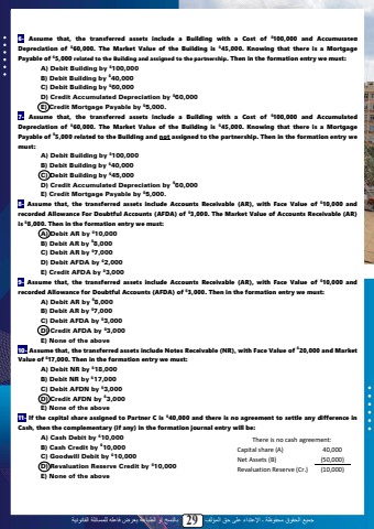 %u062c%u0645%u064a%u0639 %u0627%u0644%u062d%u0642%u0648%u0642 %u0645%u062d%u0641%u0648%u0638%u0629 %u0640 %u0627%u0625%u0644%u0639%u062a%u062f%u0627%u0621 %u0639%u0644%u0649 %u062d%u0642 %u0627%u0644%u0645%u0624%u0644%u0641 29 %u0628%u0627%u0644%u0646%u0633%u062e %u0623%u0648 %u0627%u0644%u0637%u0628%u0627%u0639%u0629 %u064a%u0639%u0631%u0636 %u0641%u0627%u0639%u0644%u0647 %u0644%u0644%u0645%u0633%u0627%u0626%u0644%u0629 %u0627%u0644%u0642%u0627%u0646%u0648%u0646%u064a%u06296- Assume that, the transferred assets include a Building with a Cost of $100,000 and Accumulated Depreciation of $60,000. The Market Value of the Building is $45,000. Knowing that there is a Mortgage Payable of $5,000 related to the Building and assigned to the partnership. Then in the formation entry we must: A) Debit Building by $100,000B) Debit Building by $40,000C) Debit Building by $60,000D) Credit Accumulated Depreciation by $60,000E) Credit Mortgage Payable by $5,000.7- Assume that, the transferred assets include a Building with a Cost of $100,000 and Accumulated Depreciation of $60,000. The Market Value of the Building is $45,000. Knowing that there is a Mortgage Payable of $5,000 related to the Building and not assigned to the partnership. Then in the formation entry we must: A) Debit Building by $100,000B) Debit Building by $40,000C) Debit Building by $45,000D) Credit Accumulated Depreciation by $60,000E) Credit Mortgage Payable by $5,000. 8- Assume that, the transferred assets include Accounts Receivable (AR), with Face Value of $10,000 and recorded Allowance For Doubtful Accounts (AFDA) of $3,000. The Market Value of Accounts Receivable (AR) is $8,000. Then in the formation entry we must: A) Debit AR by $10,000B) Debit AR by $8,000C) Debit AR by $7,000D) Debit AFDA by $2,000E) Credit AFDA by $3,0009- Assume that, the transferred assets include Accounts Receivable (AR), with Face Value of $10,000 and recorded Allowance for Doubtful Accounts (AFDA) of $3,000. Then in the formation entry we must: A) Debit AR by $8,000B) Debit AR by $7,000C) Debit AFDA by $3,000D) Credit AFDA by $3,000E) None of the above10- Assume that, the transferred assets include Notes Receivable (NR), with Face Value of $20,000 and Market Value of $17,000. Then in the formation entry we must:A) Debit NR by $18,000B) Debit NR by $17,000C) Debit AFDN by $3,000D) Credit AFDN by $3,000E) None of the above11- If the capital share assigned to Partner C is $40,000 and there is no agreement to settle any difference in Cash, then the complementary (if any) in the formation journal entry will be:A) Cash Debit by $10,000B) Cash Credit by $10,000C) Goodwill Debit by $10,000D) Revaluation Reserve Credit by $10,000E) None of the aboveThere is no cash agreement:Capital share (A) 40,000Net Assets (B) (50,000)Revaluation Reserve (Cr.) (10,000)27