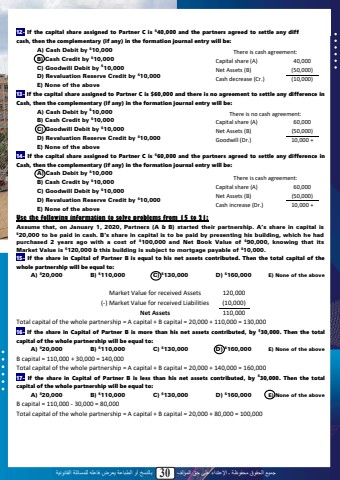 %u062c%u0645%u064a%u0639 %u0627%u0644%u062d%u0642%u0648%u0642 %u0645%u062d%u0641%u0648%u0638%u0629 %u0640 %u0627%u0625%u0644%u0639%u062a%u062f%u0627%u0621 %u0639%u0644%u0649 %u062d%u0642 %u0627%u0644%u0645%u0624%u0644%u0641 30 %u0628%u0627%u0644%u0646%u0633%u062e %u0623%u0648 %u0627%u0644%u0637%u0628%u0627%u0639%u0629 %u064a%u0639%u0631%u0636 %u0641%u0627%u0639%u0644%u0647 %u0644%u0644%u0645%u0633%u0627%u0626%u0644%u0629 %u0627%u0644%u0642%u0627%u0646%u0648%u0646%u064a%u062912- If the capital share assigned to Partner C is $40,000 and the partners agreed to settle any difference in cash, then the complementary (if any) in the formation journal entry will be:A) Cash Debit by $10,000B) Cash Credit by $10,000C) Goodwill Debit by $10,000D) Revaluation Reserve Credit by $10,000E) None of the above13- If the capital share assigned to Partner C is $60,000 and there is no agreement to settle any difference in Cash, then the complementary (if any) in the formation journal entry will be:A) Cash Debit by $10,000B) Cash Credit by $10,000C) Goodwill Debit by $10,000D) Revaluation Reserve Credit by $10,000E) None of the above14- If the capital share assigned to Partner C is $60,000 and the partners agreed to settle any difference in Cash, then the complementary (if any) in the formation journal entry will be:A) Cash Debit by $10,000B) Cash Credit by $10,000C) Goodwill Debit by $10,000D) Revaluation Reserve Credit by $10,000E) None of the aboveUse the following information to solve problems from 15 to 21:Assume that, on January 1, 2020, Partners (A & B) started their partnership. A%u2019s share in capital is $20,000 to be paid in cash. B%u2019s share in capital is to be paid by presenting his building, which he had purchased 2 years ago with a cost of $100,000 and Net Book Value of $90,000, knowing that its Market Value is $120,000 & this building is subject to mortgage payable of $10,000.15- If the share in Capital of Partner B is equal to his net assets contributed. Then the total capital of the whole partnership will be equal to: A) $20,000 B) $110,000 C) $130,000 D) $160,000 E) None of the aboveMarket Value for received Assets 120,000(-) Market Value for received Liabilities (10,000)Net Assets 110,000Total capital of the whole partnership = A capital + B capital = 20,000 + 110,000 = 130,00016- If the share in Capital of Partner B is more than his net assets contributed, by $30,000. Then the total capital of the whole partnership will be equal to: A) $20,000 B) $110,000 C) $130,000 D) $160,000 E) None of the aboveB capital = 110,000 + 30,000 = 140,000Total capital of the whole partnership = A capital + B capital = 20,000 + 140,000 = 160,00017- If the share in Capital of Partner B is less than his net assets contributed, by $30,000. Then the total capital of the whole partnership will be equal to: A) $20,000 B) $110,000 C) $130,000 D) $160,000 E) None of the aboveB capital = 110,000 - 30,000 = 80,000Total capital of the whole partnership = A capital + B capital = 20,000 + 80,000 = 100,000There is cash agreement:Capital share (A) 40,000Net Assets (B) (50,000)Cash decrease (Cr.) (10,000)There is no cash agreement:Capital share (A) 60,000Net Assets (B) (50,000)Goodwill (Dr.) 10,000 +There is cash agreement:Capital share (A) 60,000Net Assets (B) (50,000)Cash increase (Dr.) 10,000 +28