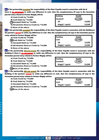 %u062c%u0645%u064a%u0639 %u0627%u0644%u062d%u0642%u0648%u0642 %u0645%u062d%u0641%u0648%u0638%u0629 %u0640 %u0627%u0625%u0644%u0639%u062a%u062f%u0627%u0621 %u0639%u0644%u0649 %u062d%u0642 %u0627%u0644%u0645%u0624%u0644%u0641 32 %u0628%u0627%u0644%u0646%u0633%u062e %u0623%u0648 %u0627%u0644%u0637%u0628%u0627%u0639%u0629 %u064a%u0639%u0631%u0636 %u0641%u0627%u0639%u0644%u0647 %u0644%u0644%u0645%u0633%u0627%u0626%u0644%u0629 %u0627%u0644%u0642%u0627%u0646%u0648%u0646%u064a%u062923- If the partnership accepted the responsibility of the Note Payable owed in connection with the Building & there is no agreement to settle any difference in cash. then the complementary (if any) in the formation journal entry related to Partner Magdy will be:A) Cash Credit by $14,000B) Cash Debit by $14,000C) Goodwill Debit by $14,000D) Revaluation Reserve Credit by $14,000E) None of the above24- If the partnership accepted the responsibility of the Note Payable owed in connection with the Building & the partners agreed to settle any difference in cash. then the complementary (if any) in the formation journal entry related to Partner Magdy will be:A) Cash Credit by $14,000B) Cash Debit by $14,000C) Goodwill Debit by $14,000D) Revaluation Reserve Credit by $14,000E) None of the above25- If the partnership did not accept the responsibility of the Note Payable owed in connection with the Building & there is no agreement to settle any difference in cash. then the complementary (if any) in the formation journal entry related to Partner Magdy will be:A) Cash Credit by $14,000B) Cash Debit by $14,000C) Goodwill Debit by $14,000D) Revaluation Reserve Credit by $14,000E) None of the above26- If the partnership did not accept the responsibility of the Note Payable owed in connection with the Building & the partners agreed to settle any difference in cash. then the complementary (if any) in the formation journal entry related to Partner Magdy will be:A) Cash Credit by $14,000B) Cash Debit by $14,000C) Goodwill Debit by $14,000D) Revaluation Reserve Credit by $14,000E) None of the aboveBuilding 48,000Goodwill 14,000NP 10,000Magdy%u2019s capital 52,000Building 48,000Cash 14,000NP 10,000Magdy%u2019s capital 52,000Building 48,000Goodwill 4,000Magdy%u2019s capital 52,000Building 48,000Cash 4,000Magdy%u2019s capital 52,00030