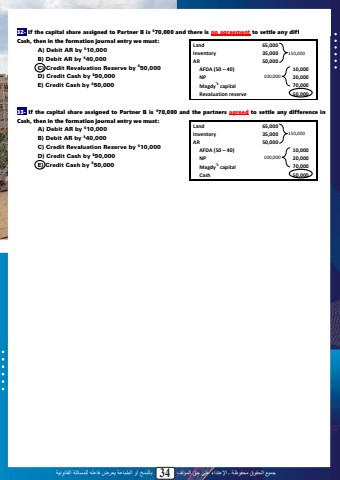 %u062c%u0645%u064a%u0639 %u0627%u0644%u062d%u0642%u0648%u0642 %u0645%u062d%u0641%u0648%u0638%u0629 %u0640 %u0627%u0625%u0644%u0639%u062a%u062f%u0627%u0621 %u0639%u0644%u0649 %u062d%u0642 %u0627%u0644%u0645%u0624%u0644%u0641 34 %u0628%u0627%u0644%u0646%u0633%u062e %u0623%u0648 %u0627%u0644%u0637%u0628%u0627%u0639%u0629 %u064a%u0639%u0631%u0636 %u0641%u0627%u0639%u0644%u0647 %u0644%u0644%u0645%u0633%u0627%u0626%u0644%u0629 %u0627%u0644%u0642%u0627%u0646%u0648%u0646%u064a%u062932- If the capital share assigned to Partner B is $70,000 and there is no agreement to settle any difference in Cash, then in the formation journal entry we must: A) Debit AR by $10,000B) Debit AR by $40,000C) Credit Revaluation Reserve by $50,000D) Credit Cash by $90,000E) Credit Cash by $50,00033- If the capital share assigned to Partner B is $70,000 and the partners agreed to settle any difference in Cash, then in the formation journal entry we must:A) Debit AR by $10,000B) Debit AR by $40,000C) Credit Revaluation Reserve by $10,000D) Credit Cash by $90,000E) Credit Cash by $50,000Land 65,000Inventory 35,000AR 50,000AFDA (50 %u2013 40) 10,000NP 20,000Magdy%u2019s capital 70,000Revaluation reserve 50,000150,000100,000Land 65,000Inventory 35,000AR 50,000AFDA (50 %u2013 40) 10,000NP 20,000Magdy%u2019s capital 70,000Cash 50,000150,000100,00032