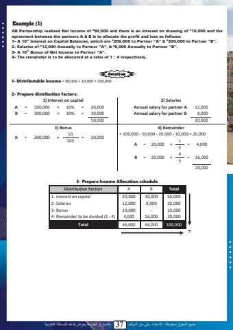 %u062c%u0645%u064a%u0639 %u0627%u0644%u062d%u0642%u0648%u0642 %u0645%u062d%u0641%u0648%u0638%u0629 %u0640 %u0627%u0625%u0644%u0639%u062a%u062f%u0627%u0621 %u0639%u0644%u0649 %u062d%u0642 %u0627%u0644%u0645%u0624%u0644%u0641 37 %u0628%u0627%u0644%u0646%u0633%u062e %u0623%u0648 %u0627%u0644%u0637%u0628%u0627%u0639%u0629 %u064a%u0639%u0631%u0636 %u0641%u0627%u0639%u0644%u0647 %u0644%u0644%u0645%u0633%u0627%u0626%u0644%u0629 %u0627%u0644%u0642%u0627%u0646%u0648%u0646%u064a%u0629Example (1)AB Partnership realized Net Income of $90,000 and there is an interest on drawing of $10,000 and the agreement between the partners A & B is to allocate the profit and loss as follows: 1- A 10% Interest on Capital Balances, which are $200,000 to Partner %u201cA%u201d & $300,000 to Partner %u201cB%u201d.2- Salaries of $12,000 Annually to Partner %u201cA%u201d, & $8,000 Annually to Partner %u201cB%u201d.3- A 10% Bonus of Net Income to Partner %u201cA%u201d.4- The remainder is to be allocated at a ratio of 1 : 4 respectively.1- Distributable income = 90,000 + 10,000 = 100,0002- Prepare distribution factors:1) Interest on capital 2) SalariesA = 200,000 %u00d7 10% = 20,000B = 300,000 %u00d7 10% = 30,00050,000Annual salary for partner A 12,000Annual salary for partner B 8,00020,0003) Bonus 4) RemainderA = 200,000 %u00d710 = 20,000 100= 100,000 - 50,000 - 20,000 - 10,000 = 20,000A = 20,000 %u00d71 = 4,000 5B = 20,000 %u00d74 = 16,000 520,0003- Prepare Income Allocation scheduleDistribution Factors A B Total1- interest on capital 20,000 30,000 50,0002- Salaries 12,000 8,000 20,0003- Bonus 10,000 - 10,0004- Remainder to be divided (1 : 4) 4,000 16,000 20,000Total 46,000 44,000 100,000=35