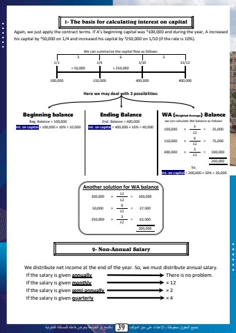 %u062c%u0645%u064a%u0639 %u0627%u0644%u062d%u0642%u0648%u0642 %u0645%u062d%u0641%u0648%u0638%u0629 %u0640 %u0627%u0625%u0644%u0639%u062a%u062f%u0627%u0621 %u0639%u0644%u0649 %u062d%u0642 %u0627%u0644%u0645%u0624%u0644%u0641 39 %u0628%u0627%u0644%u0646%u0633%u062e %u0623%u0648 %u0627%u0644%u0637%u0628%u0627%u0639%u0629 %u064a%u0639%u0631%u0636 %u0641%u0627%u0639%u0644%u0647 %u0644%u0644%u0645%u0633%u0627%u0626%u0644%u0629 %u0627%u0644%u0642%u0627%u0646%u0648%u0646%u064a%u0629Again, we just apply the contract terms. If A%u2019s beginning capital was $100,000 and during the year, A increasedhis capital by $50,000 on 1/4 and increased his capital by $250,000 on 1/10 (if the rate is 10%).We can summarize the capital flow as follows:3 6 31/1 1/4 1/10 31/12+ 50,000 + 250,000100,000 150,000 400,000 400,000Here we may deal with 3 possibilities:Beginning balance Ending Balance WA(Weighted Average) BalanceBeg. Balance = 100,000Int. on capital = 100,000 %u00d7 10% = 10,000End. Balance = 400,000Int. on capital = 400,000 %u00d7 10% = 40,000we can calculate WA balance as follows: 100,000 %u00d7 3 = 25,000 12150,000 %u00d7 6 = 75,000 12400,000 %u00d7 3 = 100,000 12200,000So,Int. on capital = 200,000 %u00d7 10% = 20,000Another solution for WA balance100,000 %u00d7 12 = 100,000 1250,000 %u00d7 9 = 37,500 12250,000 %u00d7 3 = 62,500 12200,000We distribute net income at the end of the year. So, we must distribute annual salary.If the salary is given annually There is no problem. There is no problem.If the salary is given monthly There is no problem. %u00d7 12If the salary is given semi-annually There is no problem. %u00d7 2If the salary is given quarterly There is no problem. %u00d7 41- The basis for calculating interest on capital2- Non-Annual Salary37