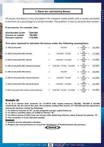 %u062c%u0645%u064a%u0639 %u0627%u0644%u062d%u0642%u0648%u0642 %u0645%u062d%u0641%u0648%u0638%u0629 %u0640 %u0627%u0625%u0644%u0639%u062a%u062f%u0627%u0621 %u0639%u0644%u0649 %u062d%u0642 %u0627%u0644%u0645%u0624%u0644%u0641 40 %u0628%u0627%u0644%u0646%u0633%u062e %u0623%u0648 %u0627%u0644%u0637%u0628%u0627%u0639%u0629 %u064a%u0639%u0631%u0636 %u0641%u0627%u0639%u0644%u0647 %u0644%u0644%u0645%u0633%u0627%u0626%u0644%u0629 %u0627%u0644%u0642%u0627%u0646%u0648%u0646%u064a%u0629Of course, the bonus is only calculated if the company makes profits and is usually calculated in the form of a percentage of a certain number. The problem is how to calculate that number.If we assume, for example, that:Distributable profit $330,000Interest on capital $55,000Partners' salaries $110,000You were required to calculate the bonus under the following assumptions:1- 10% of net profit = 330,000 %u00d710 = 33,000 1002- 10% of net profit after interest = (330,000 - 55,000) %u00d710 = 27,000 1003- 10% of net profit after salaries = (330,000 - 110,000) %u00d710 = 22,000 1004- 10% of net profit after interest & salaries = (330,000 - 55,000 - 110,000) %u00d710 = 16,000 1005- 10% of net profit after bonus = 330,000 %u00d710 = 30,000 1106- 10% of net profit after interest & bonus = (330,000 - 55,000) %u00d710 = 25,000 1107- 10% of net profit after salaries & bonus = (330,000 - 110,000) %u00d710 = 20,000 1108- 10% of net profit after interest, salaries & bonus = (330,000 - 55,000 - 110,000) %u00d710 = 15,000 110Example (2)A, B, & C started their business on 1/1/2019 with capital balances $60,000, $40,000 & 20,000respectively. By the end of the year, the company realized Net Income of $132,000 and the agreement among the partners stated the following: 1- To allow an Interest of 10% on the weighted average capital balances.2- To allow a monthly salary of $2,500 to Partner %u201cB%u201d.3- To allow a bonus of 25% from net income after deducting interest, salary & bonus for partner %u201cA%u201d.4- The remainder is to be allocated equally.Required: 1- prepare income allocation schedule. 2- Prepare the Journal Entries to record the distribution of Profit between the partners.3- Basis for calculating Bonus38