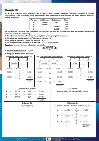 %u062c%u0645%u064a%u0639 %u0627%u0644%u062d%u0642%u0648%u0642 %u0645%u062d%u0641%u0648%u0638%u0629 %u0640 %u0627%u0625%u0644%u0639%u062a%u062f%u0627%u0621 %u0639%u0644%u0649 %u062d%u0642 %u0627%u0644%u0645%u0624%u0644%u0641 42 %u0628%u0627%u0644%u0646%u0633%u062e %u0623%u0648 %u0627%u0644%u0637%u0628%u0627%u0639%u0629 %u064a%u0639%u0631%u0636 %u0641%u0627%u0639%u0644%u0647 %u0644%u0644%u0645%u0633%u0627%u0626%u0644%u0629 %u0627%u0644%u0642%u0627%u0646%u0648%u0646%u064a%u0629Example (3)A, B, & C started their business on 1/1/2019 with capital balances $30,000, $40,000, & 50,000respectively. The following table summarizes the additions & withdrawals on their capital balances during the year:Partner Additions Reductions DateA 10,000 --- 1/10B 20,000 --- 1/4B --- 10,000 1/11C --- 5,000 1/7By the end of the year, the company realized Net Income of $41,000 and the agreement among the partners stated the following: 1- To allow an Interest of 12% on the weighted average capital balances.2- To allow an annual salary of $10,000 to Partner %u201cA%u201d.3- To allow a bonus of $5,000 for partner %u201cB%u201d.4- To allocate Profit or Loss at a ratio of 1 : 2 : 2 respectively.Required: prepare income allocation schedule. 1- Distributable income = 41,0002- Prepare distribution factors:WA capital balance for partner (A) WA capital balance for partner (B) WA capital balance for partner (C)9 31/1 1/10 31/12+ 10,00030,000 40,0003 7 21/1 1/4 1/11+ 20,000 - 10,00040,000 60,000 50,0006 61/1 1/7 31/12- 5,00050,000 45,00030,000 %u00d7 9 = 22,500 1240,000 %u00d7 3 = 10,000 1232,50040,000 %u00d7 3 = 10,000 1260,000 %u00d7 7 = 35,000 1250,000 %u00d7 2 = 8,333 1253,33350,000 %u00d7 6 = 25,000 1245,000 %u00d7 6 = 22,500 1247,5001) Interest on capital 2) SalariesA = 32,500 %u00d7 12% = 3,900B = 53,333 %u00d7 12% = 6,400C = 47,500 %u00d7 12% = 5,70016,000Annual salary for partner (A) = 10,0003) Bonus (B) 4) Remainder= 5,000 (given) = 41,000 - 16,000 - 10,000 - 5,000 = 10,000A = 10,000 %u00d71 = 2,000 5B = 10,000 %u00d72 = 4,000 5C = 10,0002 = 4,000 510,00040
