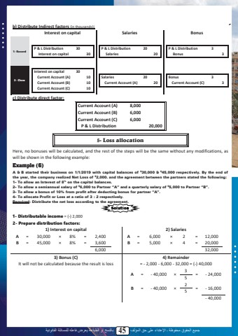 %u062c%u0645%u064a%u0639 %u0627%u0644%u062d%u0642%u0648%u0642 %u0645%u062d%u0641%u0648%u0638%u0629 %u0640 %u0627%u0625%u0644%u0639%u062a%u062f%u0627%u0621 %u0639%u0644%u0649 %u062d%u0642 %u0627%u0644%u0645%u0624%u0644%u0641 45 %u0628%u0627%u0644%u0646%u0633%u062e %u0623%u0648 %u0627%u0644%u0637%u0628%u0627%u0639%u0629 %u064a%u0639%u0631%u0636 %u0641%u0627%u0639%u0644%u0647 %u0644%u0644%u0645%u0633%u0627%u0626%u0644%u0629 %u0627%u0644%u0642%u0627%u0646%u0648%u0646%u064a%u0629b) Distribute Indirect factors (in thousands):Interest on capital Salaries Bonus1- RecordP & L Distribution 30Interest on capital 30P & L Distribution 20Salaries 20P & L Distribution 3Bonus 32- CloseInterest on capital 30Current Account (A) 10Current Account (B) 10Current Account (C) 10Salaries 20Current Account (A) 20Bonus 3Current Account (C) 3c) Distribute direct factor:Current Account (A) 8,000Current Account (B) 6,000Current Account (C) 6,000P & L Distribution 20,000Here, no bonuses will be calculated, and the rest of the steps will be the same without any modifications, as will be shown in the following example:Example (6)A & B started their business on 1/1/2019 with capital balances of $30,000 & $45,000 respectively. By the end of the year, the company realized Net Loss of $2,000. and the agreement between the partners stated the following: 1- To allow an Interest of 8% on the capital balances.2- To allow a semiannual salary of $6,000 to Partner %u201cA%u201d and a quarterly salary of $5,000 to Partner %u201cB%u201d.3- To allow a bonus of 10% from profit after deducting bonus for partner %u201cA%u201d.4- To allocate Profit or Loss at a ratio of 3 : 2 respectively.Required: Distribute the net loss according to the agreement.1- Distributable income = (-) 2,0002- Prepare distribution factors:1) Interest on capital 2) SalariesA = 30,000 %u00d7 8% = 2,400B = 45,000 %u00d7 8% = 3,6006,000A = 6,000 %u00d7 2 = 12,000B = 5,000 %u00d7 4 = 20,00032,0003) Bonus (C) 4) RemainderIt will not be calculated because the result is loss = - 2,000 - 6,000 - 32,000 = (-) 40,000A = - 40,000 %u00d73 = - 24,000 5B = - 40,000 %u00d72 = - 16,000 5- 40,000435- Loss allocation