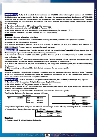 %u062c%u0645%u064a%u0639 %u0627%u0644%u062d%u0642%u0648%u0642 %u0645%u062d%u0641%u0648%u0638%u0629 %u0640 %u0627%u0625%u0644%u0639%u062a%u062f%u0627%u0621 %u0639%u0644%u0649 %u062d%u0642 %u0627%u0644%u0645%u0624%u0644%u0641 46 %u0628%u0627%u0644%u0646%u0633%u062e %u0623%u0648 %u0627%u0644%u0637%u0628%u0627%u0639%u0629 %u064a%u0639%u0631%u0636 %u0641%u0627%u0639%u0644%u0647 %u0644%u0644%u0645%u0633%u0627%u0626%u0644%u0629 %u0627%u0644%u0642%u0627%u0646%u0648%u0646%u064a%u0629Exercise (1): A, B, & C started their business on 1/1/2019 with total capital balance of $300,000divided among partners equally. By the end of the year, the company realized Net Income of $116,000. However, the accountant didn%u2019t record the interest of loan payable for partner (A) who paid $100,000 to the company on 1/7/2019 with an interest rate 12%. and the agreement among the partners stated the following: 1- To allow an Interest of 10% on the capital balances.2- To allow an annual salary of $20,000 to Partner %u201cA%u201d.3- To allow a bonus of 10% from profit after deducting bonus for partner %u201cC%u201d.4- To allocate Profit or Loss at a ratio of 4 : 3 : 3 respectively.Required: 1- prepare income allocation schedule. 2- Prepare the Journal Entries to record the drawing for each partner under perpetual system.3- prepare P & L Distribution Account.4- if current account of partner (A) $20,000 (Credit), of partner (B) $30,000 (credit) & of partner (C) $10,000 (debit). Prepare current account for each partner. Exercise (2): Assume that The Net Income of AB Partnership was $100,000. If you know that the Partnership%u2019s Agreement includes the following conditions:1- An annual salary of $10,000 should be paid to Partner (A) & a monthly Salary of $1,000 should be paid to Partner (B).2- An Interest of 12% should be computed on the Capital Balance of the partners, knowing that the partners agreed to use the weighted average capital balances of the partners.3- A bonus of 10% should be paid to Partner (A) on any profit exceeding $45,000 & after computing the bonus.4- The remaining profit should be distributed between the partners equally.Required: Prepare the Profit Distribution Schedule, knowing that the Beginning Capital Balances were $100,000 & $50,000 respectively. Partner (A) made an additional investment on 1/7 by $30,000 and Partner (B) made an additional investment on 1/10 by $20,000. Exercise (3): The Net Income of the partnership was $148,750 and the partners (A & B) agreed:1- To allow a 12% Interest on Weighted Average Capital Balances. 2- To allow a salary of $1,000 per month to Partner A.3- To allow a bonus of 10% to Partner B of Net Income after bonus and after deducting Salaries and Interest on Partners' Capital Balances.4- The remaining profit should be distributed between the partners equally.The Capital Balances for the year were as follows:Capital (A)1/7 20,000 1/1 30,0001/4 40,000End. Bal. 50,000Capital (B)1/1 60,0001/4 5,0001/10 10,000End. Bal. 75,000The partners agreed to compute an interest on drawings at rate of 10%, knowing that the withdrawals of the partners during the year were as follows:Partner Amount Date A 10,000 1/1B 5,000 1/7Required: 1- Prepare the P & L Distribution Schedule.44