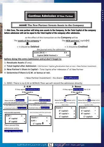 %u062c%u0645%u064a%u0639 %u0627%u0644%u062d%u0642%u0648%u0642 %u0645%u062d%u0641%u0648%u0638%u0629 %u0640 %u0627%u0625%u0644%u0639%u062a%u062f%u0627%u0621 %u0639%u0644%u0649 %u062d%u0642 %u0627%u0644%u0645%u0624%u0644%u0641 62 %u0628%u0627%u0644%u0646%u0633%u062e %u0623%u0648 %u0627%u0644%u0637%u0628%u0627%u0639%u0629 %u064a%u0639%u0631%u0636 %u0641%u0627%u0639%u0644%u0647 %u0644%u0644%u0645%u0633%u0627%u0626%u0644%u0629 %u0627%u0644%u0642%u0627%u0646%u0648%u0646%u064a%u0629In so the effect of this transaction on the Company will beThe assets of the company + The NEW partners%u2019 capital(+) %u27ad it should be Debited %u27ad it should be Creditedthe journal entry for admission:assets (M.V) + X X Capital (NEW Partner) + X Xbefore doing this entry (admission entry) don%u2019t forget to1- Revaluate Assets (if any).2- Total Capital after Admission = Old Partners' Capital + Revaluation Gain or Loss + New Partner Investment3- New Partner's Share in Capital = Total Capital after Admission x% of New Partner4- Determine if there is G.W. or bonus or not.= New Partner Investment %u2013 his share = The difference1- ZERO: There is no G.W or BONUS Then we will record the admission directly2- G.WIf they agree to record the G.WIf the result is+ (-)There is G.W. to old partnersWell o be calculated and recorded= the difference (calculated in a) x inverted ratio of new partnerand recorded separatelyG.W + x A%u2019s capital x B%u2019s capital xThen record the admission entrywith his investmentG.W. related to new partner only:Well be calculated= the difference (calculated in a) x inverted ratio of old partnersAnd recorded with the admission entryAssets + xG.W + xC%u2019s capital x3- BonusIf they agree not to record the G.WIf the result is+ (-)Bonus for the old partner which will be added to their capital by their ratio:Assets + x A%u2019s capital+ x B%u2019s capital + x C%u2019s capital+ xBonus for the new partner which will be deducted from old partners by their ratio:Assets + x A%u2019s capital - x B%u2019s capital - x C%u2019s capital+ x60Continue Admission Of New Partnersecond: The New Partner Invests Assets in the Company