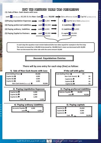 %u062c%u0645%u064a%u0639 %u0627%u0644%u062d%u0642%u0648%u0642 %u0645%u062d%u0641%u0648%u0638%u0629 %u0640 %u0627%u0625%u0644%u0639%u062a%u062f%u0627%u0621 %u0639%u0644%u0649 %u062d%u0642 %u0627%u0644%u0645%u0624%u0644%u0641 72 %u0628%u0627%u0644%u0646%u0633%u062e %u0623%u0648 %u0627%u0644%u0637%u0628%u0627%u0639%u0629 %u064a%u0639%u0631%u0636 %u0641%u0627%u0639%u0644%u0647 %u0644%u0644%u0645%u0633%u0627%u0626%u0644%u0629 %u0627%u0644%u0642%u0627%u0646%u0648%u0646%u064a%u0629(1): Sale of Non- Cash Assets with Loss: cash (+) with the price 80,000 & the Non- Cash (-) with B.v. 90,000 &the difference 10,000 (-) Capital by Ratios (2:2:1)(2)Paying Liquidation Expenses cash (-) 5,000 & (-) Capital as a loss by Ratios (2:2:1)(3) Paying preferrred Liabilities cash (-) 40,000 & Liabilities (-) 40,000(4) Paying ordinary Liabilities cash (-) 6,000 & Liabilities (-) 6,000(5) Paying Capital to Partners cash (-) 39,000 & capial (-) 39,000There will by one entry for each step (line) as follo1) Sale of Non-Cash Assets with LossCash (Selling Price) %uf0c7 80,000Capital (A) %uf0c8 4,000Capital (B) %uf0c8 4,000Capital (C) %uf0c8 2,000 Non-Cash Assets (Book Value) %uf0c8 90,000If the sell with gainsCash (Selling Price) %uf0c7 XX Non-Cash Assets) %uf0c8 XX Capital (A) %uf0c7 XX Capital (B) %uf0c7 XX Capital (C) %uf0c7 XX2) Paying Liquidation ExpensesCapital (A) %uf0c8 2,000Capital (B) %uf0c8 2,000Capital (C) %uf0c8 1,000 Cash %uf0c8 5,0003) Paying preferred Liabilities Salaries Payable %uf0c8 40,000 cash %uf0c8 40,0004) Paying ordinary Liabilities Accounts Payable %uf0c8 6,000 cash %uf0c8 6,000 1)5) Paying capitalsCapital (A) %uf0c8 23,000Capital (B) %uf0c8 8,000Capital (C) %uf0c8 5,000 Cash %uf0c8 36,000 2)In each step the equation must remain balanced (the two sides equal) for example in the first step The assets increased by (+ 80,000 & decreased by -90,000) that%u2019s mean we decreased with 10,000 Then we decreased the other side with the same amount 10,000Second: Liquidation Entries70