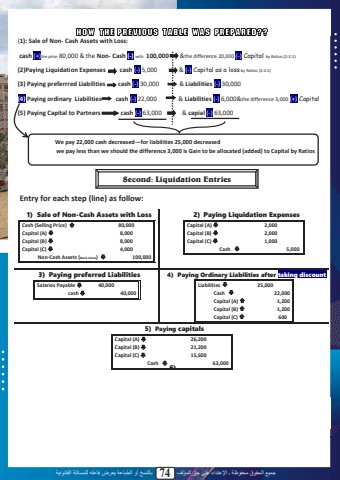 %u062c%u0645%u064a%u0639 %u0627%u0644%u062d%u0642%u0648%u0642 %u0645%u062d%u0641%u0648%u0638%u0629 %u0640 %u0627%u0625%u0644%u0639%u062a%u062f%u0627%u0621 %u0639%u0644%u0649 %u062d%u0642 %u0627%u0644%u0645%u0624%u0644%u0641 74 %u0628%u0627%u0644%u0646%u0633%u062e %u0623%u0648 %u0627%u0644%u0637%u0628%u0627%u0639%u0629 %u064a%u0639%u0631%u0636 %u0641%u0627%u0639%u0644%u0647 %u0644%u0644%u0645%u0633%u0627%u0626%u0644%u0629 %u0627%u0644%u0642%u0627%u0646%u0648%u0646%u064a%u0629(1): Sale of Non- Cash Assets with Loss:cash (+)the price 80,000 & the Non- Cash (-) with. 100,000 &the difference 20,000 (-) Capital by Ratios (2:2:1)(2)Paying Liquidation Expenses cash (-) 5,000 & (-) Capital as a loss by Ratios (2:2:1)(3) Paying preferrred Liabilities cash (-) 30,000 & Liabilities (-) 30,000(4) Paying ordinary Liabilities cash (-) 22,000 & Liabilities (-) 6,000&the difference 3,000 (+) Capital(5) Paying Capital to Partners cash (-) 63,000 & capial (-) 63,000Entry for each step (line) as follo1) Sale of Non-Cash Assets with LossCash (Selling Price) %uf0c7 80,000Capital (A) %uf0c8 8,000Capital (B) %uf0c8 8,000Capital (C) %uf0c8 4,000 Non-Cash Assets (Book Value) %uf0c8 100,0002) Paying Liquidation ExpensesCapital (A) %uf0c8 2,000Capital (B) %uf0c8 2,000Capital (C) %uf0c8 1,000 Cash %uf0c8 5,0003) Paying preferred Liabilities Salaries Payable %uf0c8 40,000 cash %uf0c8 40,0004) Paying Ordinary Liabilities after taking discountLiabilities %uf0c8 25,000 Cash %uf0c8 22,000 Capital (A) %uf0c7 1,200 Capital (B) %uf0c7 1,200 Capital (C) %uf0c7 6005) Paying capitalsCapital (A) %uf0c8 26,200Capital (B) %uf0c8 21,200Capital (C) %uf0c8 15,600 Cash %uf0c8 63,000 6)We pay 22,000 cash decreased%u2014for liabilities 25,000 decreasedwe pay less than we should the difference 3,000 is Gain to be allocated (added) to Capital by Ratios72Second: Liquidation Entries