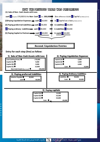 %u062c%u0645%u064a%u0639 %u0627%u0644%u062d%u0642%u0648%u0642 %u0645%u062d%u0641%u0648%u0638%u0629 %u0640 %u0627%u0625%u0644%u0639%u062a%u062f%u0627%u0621 %u0639%u0644%u0649 %u062d%u0642 %u0627%u0644%u0645%u0624%u0644%u0641 76 %u0628%u0627%u0644%u0646%u0633%u062e %u0623%u0648 %u0627%u0644%u0637%u0628%u0627%u0639%u0629 %u064a%u0639%u0631%u0636 %u0641%u0627%u0639%u0644%u0647 %u0644%u0644%u0645%u0633%u0627%u0626%u0644%u0629 %u0627%u0644%u0642%u0627%u0646%u0648%u0646%u064a%u0629(1): Sale of Non- Cash Assets with Loss:cash (+)the price 170,000 & the Non- Cash (-) with. 200,000 &the difference 30,000 (-) Capital by Ratios (2:2:1)(2)Paying Liquidation Expenses cash (-) 10,000 & (-) Capital as a loss by Ratios (2:2:1)(3) Paying preferrred Liabilities cash (-) 30,000 & Liabilities (-) 30,000(4) Paying ordinary Liabilities cash (-) 90,000 & Liabilities (-) 90,000(5) Paying Capital to Partners cash (-) 60,000 & capial (-) 60,000Entry for each step (line) as follo1) Sale of Non-Cash Assets with LossCash (Selling Price) %uf0c7 170,000Capital (A) %uf0c8 9,000Capital (B) %uf0c8 9,000Capital (C) %uf0c8 12,000 Non-Cash Assets (Book Value) %uf0c8 200,0002) Paying Liquidation ExpensesCapital (A) %uf0c8 3,000Capital (B) %uf0c8 3,000Capital (C) %uf0c8 4,000 Cash %uf0c8 10,0003) Paying preferred Liabilities Salaries Payable %uf0c8 30,000 cash %uf0c8 30,0004) Paying Ordinary Liabilities Liabilities %uf0c8 90,000 Cash %uf0c8 90,0005) Paying capitalsCapital (A) %uf0c8 13,200Capital (B) %uf0c8 23,200Capital (C) %uf0c8 24,600 Cash %uf0c8 60,000 6)74Second: Liquidation Entries