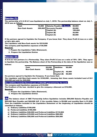 %u062c%u0645%u064a%u0639 %u0627%u0644%u062d%u0642%u0648%u0642 %u0645%u062d%u0641%u0648%u0638%u0629 %u0640 %u0627%u0625%u0644%u0639%u062a%u062f%u0627%u0621 %u0639%u0644%u0649 %u062d%u0642 %u0627%u0644%u0645%u0624%u0644%u0641 77 %u0628%u0627%u0644%u0646%u0633%u062e %u0623%u0648 %u0627%u0644%u0637%u0628%u0627%u0639%u0629 %u064a%u0639%u0631%u0636 %u0641%u0627%u0639%u0644%u0647 %u0644%u0644%u0645%u0633%u0627%u0626%u0644%u0629 %u0627%u0644%u0642%u0627%u0646%u0648%u0646%u064a%u0629Exercise (1):The partnership of A & B & C was liquidated on July 1, 2016. The partnership balance sheet on July 1, 2019 was as follows:Cash 10,000 Salaries Payable (5 Months) 80,000Non-Cash Assets 290,000 Accounts Payable 20,000Capital (A) 100,000Capital (B) 20,000Capital (C) 80,000If the partners agreed to liquidate the Company. If you know that: They share Profit & Loss on a ratioof 30%:30%:40%The Liquidator sold Non-Cash assets for $310,000The company paid liquidation expenses of $5,000Required:1. Prepare the Liquidation Table (Statement). 2. Prepare the Liquidation EntriesExercise (2):A & B are two partners in a Partnership. They share Profit & Loss on a ratio of 70%: 30%. They agree to liquidate the partnership. The Balance sheet of the Partnership at the date of the liquidation was as follows:Cash 20,000 liabilities 50,000Non-Cash Assets 120,000Capital (A) 40,000Capital (B) 50,000the partners agreed to liquidate the Company. If you know that:The Liquidator sold Non-Cash assets for $102,000 , knowing that these assets included Land of B.V $60,000 and sold for $45,000.The Liabilities included Secured Loan of $40,000 guaranteed by the Land.The company paid liquidation expenses of $10,000The Creditors of the loan decided to give the company a discount on $15,000.Required:1. Prepare the Liquidation Table (Statement). 2. Prepare the Liquidation Entries(3) The balance sheet of ABC Partnership before liquidation includes $50,000 Salaries Payable and $60,000 Rent Payable and $40,000 A/P. if the monthly Salary is $5,000 and monthly Rent is $1,000. Then the Liabilities included in the Liquidation Statement at the beginning of Liquidation should be classified as follows: a) Ordinary Liabilities $150,000b) Preferred Liabilities $150,000c) Ordinary Liabilities $40,000 and Preferred Liabilities $110,000d) Ordinary Liabilities $70,000 and Preferred Liabilities $80,000e) Ordinary Liabilities $96,000 and Preferred Liabilities $54,00075