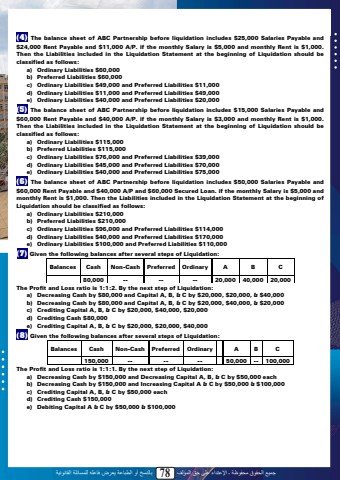 %u062c%u0645%u064a%u0639 %u0627%u0644%u062d%u0642%u0648%u0642 %u0645%u062d%u0641%u0648%u0638%u0629 %u0640 %u0627%u0625%u0644%u0639%u062a%u062f%u0627%u0621 %u0639%u0644%u0649 %u062d%u0642 %u0627%u0644%u0645%u0624%u0644%u0641 78 %u0628%u0627%u0644%u0646%u0633%u062e %u0623%u0648 %u0627%u0644%u0637%u0628%u0627%u0639%u0629 %u064a%u0639%u0631%u0636 %u0641%u0627%u0639%u0644%u0647 %u0644%u0644%u0645%u0633%u0627%u0626%u0644%u0629 %u0627%u0644%u0642%u0627%u0646%u0648%u0646%u064a%u0629(4) The balance sheet of ABC Partnership before liquidation includes $25,000 Salaries Payable and $24,000 Rent Payable and $11,000 A/P. if the monthly Salary is $5,000 and monthly Rent is $1,000. Then the Liabilities included in the Liquidation Statement at the beginning of Liquidation should be classified as follows: a) Ordinary Liabilities $60,000b) Preferred Liabilities $60,000c) Ordinary Liabilities $49,000 and Preferred Liabilities $11,000d) Ordinary Liabilities $11,000 and Preferred Liabilities $49,000e) Ordinary Liabilities $40,000 and Preferred Liabilities $20,000(5) The balance sheet of ABC Partnership before liquidation includes $15,000 Salaries Payable and $60,000 Rent Payable and $40,000 A/P. if the monthly Salary is $3,000 and monthly Rent is $1,000. Then the Liabilities included in the Liquidation Statement at the beginning of Liquidation should be classified as follows: a) Ordinary Liabilities $115,000b) Preferred Liabilities $115,000c) Ordinary Liabilities $76,000 and Preferred Liabilities $39,000d) Ordinary Liabilities $45,000 and Preferred Liabilities $70,000e) Ordinary Liabilities $40,000 and Preferred Liabilities $75,000(6) The balance sheet of ABC Partnership before liquidation includes $50,000 Salaries Payable and $60,000 Rent Payable and $40,000 A/P and $60,000 Secured Loan. if the monthly Salary is $5,000 and monthly Rent is $1,000. Then the Liabilities included in the Liquidation Statement at the beginning of Liquidation should be classified as follows: a) Ordinary Liabilities $210,000b) Preferred Liabilities $210,000c) Ordinary Liabilities $96,000 and Preferred Liabilities $114,000d) Ordinary Liabilities $40,000 and Preferred Liabilities $170,000e) Ordinary Liabilities $100,000 and Preferred Liabilities $110,000(7) Given the following balances after several steps of Liquidation:Balances Cash Non-Cash Preferred Ordinary A B C80,000 -- -- -- 20,000 40,000 20,000The Profit and Loss ratio is 1:1:2. By the next step of Liquidation:a) Decreasing Cash by $80,000 and Capital A, B, & C by $20,000, $20,000, & $40,000b) Decreasing Cash by $80,000 and Capital A, B, & C by $20,000, $40,000, & $20,000c) Crediting Capital A, B, & C by $20,000, $40,000, $20,000d) Crediting Cash $80,000e) Crediting Capital A, B, & C by $20,000, $20,000, $40,000(8) Given the following balances after several steps of Liquidation:Balances Cash Non-Cash Preferred Ordinary A B C150,000 -- -- -- 50,000 -- 100,000The Profit and Loss ratio is 1:1:1. By the next step of Liquidation:a) Decreasing Cash by $150,000 and Decreasing Capital A, B, & C by $50,000 eachb) Decreasing Cash by $150,000 and Increasing Capital A & C by $50,000 & $100,000c) Crediting Capital A, B, & C by $50,000 eachd) Crediting Cash $150,000e) Debiting Capital A & C by $50,000 & $100,00076