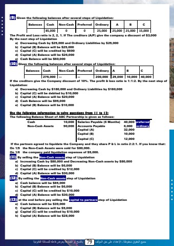 %u062c%u0645%u064a%u0639 %u0627%u0644%u062d%u0642%u0648%u0642 %u0645%u062d%u0641%u0648%u0638%u0629 %u0640 %u0627%u0625%u0644%u0639%u062a%u062f%u0627%u0621 %u0639%u0644%u0649 %u062d%u0642 %u0627%u0644%u0645%u0624%u0644%u0641 79 %u0628%u0627%u0644%u0646%u0633%u062e %u0623%u0648 %u0627%u0644%u0637%u0628%u0627%u0639%u0629 %u064a%u0639%u0631%u0636 %u0641%u0627%u0639%u0644%u0647 %u0644%u0644%u0645%u0633%u0627%u0626%u0644%u0629 %u0627%u0644%u0642%u0627%u0646%u0648%u0646%u064a%u0629(9) Given the following balances after several steps of Liquidation:Balances Cash Non-Cash Preferred Ordinary A B C85,000 0 0 25,000 25,000 25,000 15,000The Profit and Loss ratio is 2, 2, 1. If The creditors (A/P) give the company a discount of $3,000By the next step of Liquidationa) Decreasing Cash by $25,000 and Ordinary Liabilities by $25,000b) Capital (B) Balance will be $25,000c) Capital (C) will be credited by $600d) Capital (A) Balance will be $26,000e) Cash Balance will be $60,000(10) Given the following balances after several steps of Liquidation:Balances Cash Non-Cash Preferred Ordinary A B C275,000 -- -- 200,000 25,000 10,000 40,000If the creditors give the Company discount of 10%. The profit & loss ratio is 1:1:2. By the next step of Liquidation:a) Decreasing Cash by $180,000 and Ordinary Liabilities by $180,000b) Capital (C) will be debited by $10,000c) Capital (A) Balance will be $20,000d) Cash Balance will be $95,000e) Capital (B) Balance will be $10,000Use the following information to solve questions from 11 to 13:The following Balance Sheet of ABC Partnership is given as follows:Cash 10,000 Salaries Payable (6 Months) 40,000 preferredNon-Cash Assets 90,000 Accounts Payable 6,000 ordinaryCapital (A) 32,000Capital (B) 10,000Capital (C) 12,000If the partners agreed to liquidate the Company and they share P & L in ratio 2:2:1. If you know that:On 1/5 the Non-Cash Assets were sold for $80,000.On 1/6 the company paid liquidation expenses of $5,000.(11) By selling the Non-Cash assets step of Liquidationa) Increasing Cash by $80,000 and Decreasing Non-Cash assets by $80,000b) Capital (B) Balance will be $6,000c) Capital (C) will be credited by $12,000d) Capital (A) Balance will be $30,000(12) By selling the Non-Cash assets step of Liquidationa) Cash balance will be $85,000b) Capital (B) Balance will be $6,000c) Capital (C) will be credited by $10,000d) Capital (A) Balance will be $30,000(13) at the end before pay selling the capital to partners step of Liquidatione) Cash balance will be $39,000f) Capital (B) Balance will be $5,000g) Capital (C) will be credited by $10,000h) Capital (A) Balance will be $28,00077