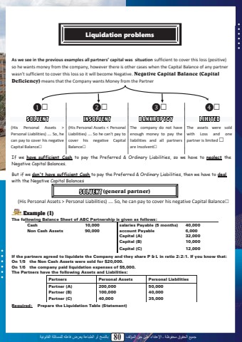 %u062c%u0645%u064a%u0639 %u0627%u0644%u062d%u0642%u0648%u0642 %u0645%u062d%u0641%u0648%u0638%u0629 %u0640 %u0627%u0625%u0644%u0639%u062a%u062f%u0627%u0621 %u0639%u0644%u0649 %u062d%u0642 %u0627%u0644%u0645%u0624%u0644%u0641 80 %u0628%u0627%u0644%u0646%u0633%u062e %u0623%u0648 %u0627%u0644%u0637%u0628%u0627%u0639%u0629 %u064a%u0639%u0631%u0636 %u0641%u0627%u0639%u0644%u0647 %u0644%u0644%u0645%u0633%u0627%u0626%u0644%u0629 %u0627%u0644%u0642%u0627%u0646%u0648%u0646%u064a%u0629As we see in the previous examples all partners%u2019 capital was situation sufficient to cover this loss (positive) so he wants money from the company, however there is other cases when the Capital Balance of any partner wasn't sufficient to cover this loss so it will become Negative. Negative Capital Balance (Capital Deficiency) means that the Company wants Money from the Partner%u2776%u02c7 %u2777%u02c7 %u2778%u02c7 %u2779%u02c7The assets were sold with Loss and one partner is limited %u02c7The company do not have enough money to pay the liabilities and all partners are Insolvent%u02c7(His Personal Assets < Personal Liabilities) %u2026. So he can't pay to cover his negative Capital Balance%u02c7(His Personal Assets > Personal Liabilities) %u2026. So, he can pay to cover his negative Capital Balance%u02c7If we have sufficient Cash to pay the Preferred & Ordinary Liabilities, so we have to neglect the Negative Capital Balances. But if we don't have sufficient Cash to pay the Preferred & Ordinary Liabilities, then we have to dealwith the Negative Capital Balances(His Personal Assets > Personal Liabilities) %u2026. So, he can pay to cover his negative Capital Balance%u02c7Example (1)The following Balance Sheet of ABC Partnership is given as follows:Cash 10,000 salaries Payable (5 months) 40,000Non Cash Assets 90,000 account Payable 6,000Capital (A) 32,000Capital (B) 10,000Capital (C) 12,000If the partners agreed to liquidate the Company and they share P & L in ratio 2:2:1. If you know that:On 1/5 the Non Cash Assets were sold for $20,000.On 1/6 the company paid liquidation expenses of $5,000.The Partners have the following Assets and Liabilities:Partners Personal Assets Personal LiabilitiesPartner (A) 200,000 50,000Partner (B) 100,000 40,000Partner (C) 40,000 35,000Required: Prepare the Liquidation Table (Statement)78Liquidation problems(general partner)