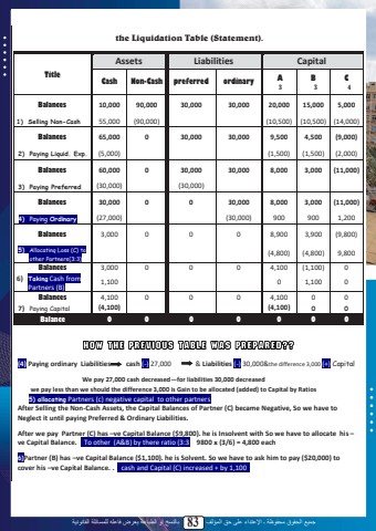 %u062c%u0645%u064a%u0639 %u0627%u0644%u062d%u0642%u0648%u0642 %u0645%u062d%u0641%u0648%u0638%u0629 %u0640 %u0627%u0625%u0644%u0639%u062a%u062f%u0627%u0621 %u0639%u0644%u0649 %u062d%u0642 %u0627%u0644%u0645%u0624%u0644%u0641 83 %u0628%u0627%u0644%u0646%u0633%u062e %u0623%u0648 %u0627%u0644%u0637%u0628%u0627%u0639%u0629 %u064a%u0639%u0631%u0636 %u0641%u0627%u0639%u0644%u0647 %u0644%u0644%u0645%u0633%u0627%u0626%u0644%u0629 %u0627%u0644%u0642%u0627%u0646%u0648%u0646%u064a%u0629the Liquidation Table (Statement).TitleAssets Liabilities CapitalCash Non-Cash preferred ordinary A 3B 3C 4Balances 10,000 90,000 30,000 30,000 20,000 15,000 5,0001) Selling Non-Cash 55,000 (90,000) (10,500) (10,500) (14,000)Balances 65,000 0 30,000 30,000 9,500 4,500 (9,000)2) Paying Liquid. Exp. (5,000) (1,500) (1,500) (2,000)Balances 60,000 0 30,000 30,000 8,000 3,000 (11,000)3) Paying Preferred (30,000) (30,000)Balances 30,000 0 0 30,000 8,000 3,000 (11,000)4) Paying Ordinary (27,000) (30,000) 900 900 1,200Balances 3,000 0 0 0 8,900 3,900 (9,800)5) Allocating Loss (C) to other Partners(3:3) (4,800) (4,800) 9,800Balances 3,000 0 0 0 4,100 (1,100) 06) Taking Cash from Partners (B) 1,100 0 1,100 0Balances 4,100 0 0 0 4,100 0 07) Paying Capital (4,100) (4,100) 0 0Balance 0 0 0 0 0 0 0(4) Paying ordinary Liabilities cash (-) 27,000 & Liabilities (-) 30,000&the difference 3,000 (+) CapitalWe pay 27,000 cash decreased%u2014for liabilities 30,000 decreasedwe pay less than we should the difference 3,000 is Gain to be allocated (added) to Capital by Ratios5) allocating Partners (c) negative capital to other partnersAfter Selling the Non-Cash Assets, the Capital Balances of Partner (C) became Negative, So we have to Neglect it until paying Preferred & Ordinary Liabilities.After we pay Partner (C) has %u2013ve Capital Balance ($9,800). he is Insolvent with So we have to allocate his %u2013ve Capital Balance. To other (A&B) by there ratio (3:3 = 9800 x (3/6) = 4,800 each 6)Partner (B) has %u2013ve Capital Balance ($1,100). he is Solvent. So we have to ask him to pay ($20,000) to cover his %u2013ve Capital Balance. . cash and Capital (C) increased + by 1,100 81