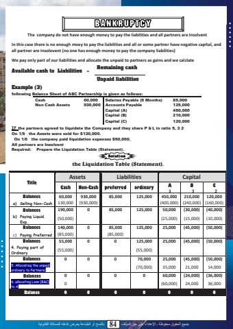 %u062c%u0645%u064a%u0639 %u0627%u0644%u062d%u0642%u0648%u0642 %u0645%u062d%u0641%u0648%u0638%u0629 %u0640 %u0627%u0625%u0644%u0639%u062a%u062f%u0627%u0621 %u0639%u0644%u0649 %u062d%u0642 %u0627%u0644%u0645%u0624%u0644%u0641 84 %u0628%u0627%u0644%u0646%u0633%u062e %u0623%u0648 %u0627%u0644%u0637%u0628%u0627%u0639%u0629 %u064a%u0639%u0631%u0636 %u0641%u0627%u0639%u0644%u0647 %u0644%u0644%u0645%u0633%u0627%u0626%u0644%u0629 %u0627%u0644%u0642%u0627%u0646%u0648%u0646%u064a%u0629The company do not have enough money to pay the liabilities and all partners are InsolventIn this case there is no enough moey to pay the liabilities and all or some partner have negative capital, and all partner are Insolovent (no one has enough money to pay the company liabilities) We pay only part of our liabilities and allocate the unpaid to partners as gains and we calclate Available cash to Liabilities = Example (3)following Balance Sheet of ABC Partnership is given as follows:Cash 60,000 Salaries Payable (5 Months) 85,000Non Cash Assets 930,000 Accounts Payable 125,000Capital (A) 450,000Capital (B) 210,000Capital (C) 120,000If the partners agreed to liquidate the Company and they share P & L in ratio 5, 3 2On 1/5 the Assets were sold for $130,000. On 1/6 the company paid liquidation expenses $50,000.All partners are Insolvent Required: Prepare the Liquidation Table (Statement).the Liquidation Table (Statement).TitleAssets Liabilities CapitalCash Non-Cash preferred ordinary A 5B 3C 2Balances 60,000 930,000 85,000 125,000 450,000 210,000 120,000a) Selling Non-Cash 130,000 (930,000) (400,000) (240,000) (160,000)Balances 190,000 0 85,000 125,000 50,000 (30,000) (40,000)b) Paying Liquid. Exp. (50,000) (25,000) (15,000) (10,000)Balances 140,000 0 85,000 125,000 25,000 (45,000) (50,000)c) Paying Preferred (85,000) (85,000)Balances 55,000 0 0 125,000 25,000 (45,000) (50,000)4. Paying part of Ordinary (55,000) (55,000)Balances 0 0 0 70,000 25,000 (45,000) (50,000)5. Allocating the unpaid ordinary to Partners) (70,000) 35,000 21,000 14,000Balances 0 0 0 0 60,000 (24,000) (36,000)6. allocating Loss (B&C) to A0 (60,000) 24,000 36,000Balance 0 0 0 0 0 0 0Remaining cashUnpaid liabilities82