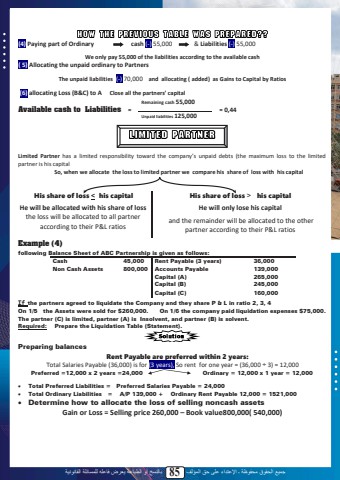 %u062c%u0645%u064a%u0639 %u0627%u0644%u062d%u0642%u0648%u0642 %u0645%u062d%u0641%u0648%u0638%u0629 %u0640 %u0627%u0625%u0644%u0639%u062a%u062f%u0627%u0621 %u0639%u0644%u0649 %u062d%u0642 %u0627%u0644%u0645%u0624%u0644%u0641 85 %u0628%u0627%u0644%u0646%u0633%u062e %u0623%u0648 %u0627%u0644%u0637%u0628%u0627%u0639%u0629 %u064a%u0639%u0631%u0636 %u0641%u0627%u0639%u0644%u0647 %u0644%u0644%u0645%u0633%u0627%u0626%u0644%u0629 %u0627%u0644%u0642%u0627%u0646%u0648%u0646%u064a%u0629(4) Paying part of Ordinary cash (-) 55,000 & Liabilities (-) 55,000We only pay 55,000 of the liabilities according to the available cash( 5) Allocating the unpaid ordinary to Partners The unpaid liabilities (-) 70,000 and allocating ( added) as Gains to Capital by Ratios(6) allocating Loss (B&C) to A Close all the partners%u2019 capitalAvailable cash to Liabilities = = 0,44Limited Partner has a limited responsibility toward the company%u2019s unpaid debts (the maximum loss to the limited partner is his capitalSo, when we allocate the loss to limited partner we compare his share of loss with his capital His share of loss > his capital His share of loss < his capitalHe will be allocated with his share of lossthe loss will be allocated to all partner according to their P&L ratiosHe will only lose his capitaland the remainder will be allocated to the other partner according to their P&L ratiosExample (4)following Balance Sheet of ABC Partnership is given as follows:Cash 45,000 Rent Payable (3 years) 36,000Non Cash Assets 800,000 Accounts Payable 139,000Capital (A) 265,000Capital (B) 245,000Capital (C) 160,000If the partners agreed to liquidate the Company and they share P & L in ratio 2, 3, 4On 1/5 the Assets were sold for $260,000. On 1/6 the company paid liquidation expenses $75,000.The partner (C) is limited, partner (A) is Insolvent, and partner (B) is solvent.Required: Prepare the Liquidation Table (Statement).Preparing balancesRent Payable are preferred within 2 years:Total Salaries Payable (36,000) is for (3 years), So rent for one year = (36,000 %u00f7 3) = 12,000Preferred =12,000 x 2 years =24,000 Ordinary = 12,000 x 1 year = 12,000%u2022 Total Preferred Liabilities = Preferred Salaries Payable = 24,000%u2022 Total Ordinary Liabilities = A/P 139,000 + Ordinary Rent Payable 12,000 = 1521,000 %u2022 Determine how to allocate the loss of selling noncash assets Gain or Loss = Selling price 260,000 %u2013 Book value800,000( 540,000)Remaining cash 55,000Unpaid liabilities 125,00083