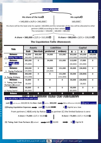 %u062c%u0645%u064a%u0639 %u0627%u0644%u062d%u0642%u0648%u0642 %u0645%u062d%u0641%u0648%u0638%u0629 %u0640 %u0627%u0625%u0644%u0639%u062a%u062f%u0627%u0621 %u0639%u0644%u0649 %u062d%u0642 %u0627%u0644%u0645%u0624%u0644%u0641 86 %u0628%u0627%u0644%u0646%u0633%u062e %u0623%u0648 %u0627%u0644%u0637%u0628%u0627%u0639%u0629 %u064a%u0639%u0631%u0636 %u0641%u0627%u0639%u0644%u0647 %u0644%u0644%u0645%u0633%u0627%u0626%u0644%u0629 %u0627%u0644%u0642%u0627%u0646%u0648%u0646%u064a%u0629Partner (C)limited%u02c7His share of the loss%u02c7 His capital%u02c7= 540,000 x (4/9 )= 240,000%u02c7 160,000%u02c7His share will be the least only his capital ( 160,000) and the remainder of the loss will be allocated to other partners (A&B) according to their rations 2:3=5 The remainder = 540,000 %u2013 160,000 = 380,000A share = 380,000 x (2/5 )= 152,000%u02c7 B share = 380,000 x (3/5 )= 228,000%u02c7The Liquidation Table (Statement).Title Assets Liabilities CapitalCash Non-Cash preferred ordinary A 2 B 3 C 4Balances 45,000 800,000 24,000 151,000 265,000 245,000 160,0001. Selling Non-Cash 260,000 (800,000) (152,000) (228,000) (160,000)Balances 305,000 0 24,000 151,000 113,000 17,000 02. Paying Liquid. Exp. (75,000) (30,000) (45,000)Balances 230,000 0 24,000 151,000 83,000 (28,000) 03. Paying Preferred (24,000) (24,000)Balances 206,000 0 0 151,000 83,000 (28,000) 04. Paying Ordinary (151,000) (151,000)Balances 55,000 0 0 0 83,000 (28,000) 05. Taking Cash from Partners (B) solvent 28,000 28,000Balances 83,000 0 0 0 83,000 0 06. Paying Capital (83,000) (83,000)Balance 0 0 0 0 0 0 0(1): Sale of Non- Cash Assets with Loss: cash (+) with the price 260,000 & the Non- Cash (-) with B.v. 800,000 &the difference 540,000 (-) Capital as prepared(2)Paying Liquidation Expenses cash (-) 75,000 & (-) Capital as a lossFrom partners ( A&B) only by Ratios (2:3) as partner (C) the limited balance is zeroA share = 75,000 x (2/5 )= 30,000%u02c7 B share = 75,000 x (3/5 )= 45,000%u02c7(5) Taking Cash from Partners (B) solvent cash (-) 28,000 & (+) Capital B 84