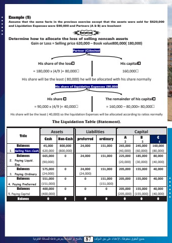 %u062c%u0645%u064a%u0639 %u0627%u0644%u062d%u0642%u0648%u0642 %u0645%u062d%u0641%u0648%u0638%u0629 %u0640 %u0627%u0625%u0644%u0639%u062a%u062f%u0627%u0621 %u0639%u0644%u0649 %u062d%u0642 %u0627%u0644%u0645%u0624%u0644%u0641 87 %u0628%u0627%u0644%u0646%u0633%u062e %u0623%u0648 %u0627%u0644%u0637%u0628%u0627%u0639%u0629 %u064a%u0639%u0631%u0636 %u0641%u0627%u0639%u0644%u0647 %u0644%u0644%u0645%u0633%u0627%u0626%u0644%u0629 %u0627%u0644%u0642%u0627%u0646%u0648%u0646%u064a%u0629Example (5)Assume that the same facts in the previous exercise except that the assets were sold for $620,000 and Liquidation Expenses were $90,000 and Partners (A & B) are InsolventDetermine how to allocate the loss of selling noncash assets Gain or Loss = Selling price 620,000 %u2013 Book value800,000( 180,000)Partner (C)limited%u02c7His share of the loss%u02c7 His capital%u02c7= 180,000 x (4/9 )= 80,000%u02c7 160,000%u02c7His share will be the least ( 80,000) he will be allocated with his share normallyHis share of liquidation Expenses (90,000%u02c7His share %u02c7 The remainder of his capital%u02c7= 90,000 x (4/9 )= 40,000%u02c7 = 160,000 %u2013 80,000= 80,000%u02c7His share will be the least ( 40,000) so the liquidation Expenses will be allocated according to ratios normally The Liquidation Table (Statement).TitleAssets Liabilities CapitalCash Non-Cash preferred ordinary A 2B 3C 4Balances 45,000 800,000 24,000 151,000 265,000 245,000 160,0001. Selling Non-Cash 620,000 (800,000) (40,000) (60,000) (80,000)Balances 665,000 0 24,000 151,000 225,000 185,000 80,0002. Paying Liquid. Exp. (90,000) (20,000) (30,000) (40,000)Balances 575,000 0 24,000 151,000 205,000 155,000 40,0003. Paying Ordinary (24,000) (24,000)Balances 551,000 0 0 151,000 205,000 155,000 40,0004. Paying Preferred (151,000) (151,000)Balances 400,000 0 0 0 205,000 155,000 40,0005. Paying Capital (400,000) (205,000) (155,000) (40,000)Balance 0 0 0 0 0 0 085