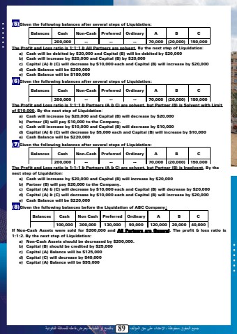 %u062c%u0645%u064a%u0639 %u0627%u0644%u062d%u0642%u0648%u0642 %u0645%u062d%u0641%u0648%u0638%u0629 %u0640 %u0627%u0625%u0644%u0639%u062a%u062f%u0627%u0621 %u0639%u0644%u0649 %u062d%u0642 %u0627%u0644%u0645%u0624%u0644%u0641 89 %u0628%u0627%u0644%u0646%u0633%u062e %u0623%u0648 %u0627%u0644%u0637%u0628%u0627%u0639%u0629 %u064a%u0639%u0631%u0636 %u0641%u0627%u0639%u0644%u0647 %u0644%u0644%u0645%u0633%u0627%u0626%u0644%u0629 %u0627%u0644%u0642%u0627%u0646%u0648%u0646%u064a%u0629(5)Given the following balances after several steps of Liquidation:Balances Cash Non-Cash Preferred Ordinary A B C200,000 -- -- -- 70,000 (20,000) 150,000The Profit and Loss ratio is 1:1:1 & All Partners are solvent. By the next step of Liquidation:a) Cash will be debited by $20,000 and Capital (B) will be debited by $20,000b) Cash will increase by $20,000 and Capital (B) by $20,000c) Capital (A) & (C) will decrease by $10,000 each and Capital (B) will increase by $20,000 d) Cash Balance will be $200,000e) Cash Balance will be $180,000(6)Given the following balances after several steps of Liquidation:Balances Cash Non-Cash Preferred Ordinary A B C200,000 -- -- -- 70,000 (20,000) 150,000The Profit and Loss ratio is 1:1:1 & Partners (A & C) are solvent, but Partner (B) is Solvent with Limit of $10,000. By the next step of Liquidation:a) Cash will increase by $20,000 and Capital (B) will decrease by $20,000b) Partner (B) will pay $10,000 to the Company.c) Cash will increase by $10,000 and Capital (B) will decrease by $10,000d) Capital (A) & (C) will decrease by $5,000 each and Capital (B) will increase by $10,000 e) Cash Balance will be $220,000(7)Given the following balances after several steps of Liquidation:Balances Cash Non-Cash Preferred Ordinary A B C200,000 -- -- -- 70,000 (20,000) 150,000The Profit and Loss ratio is 1:1:1 & Partners (A & C) are solvent, but Partner (B) is Insolvent. By the next step of Liquidation:a) Cash will increase by $20,000 and Capital (B) will increase by $20,000b) Partner (B) will pay $20,000 to the Company.c) Capital (A) & (C) will decrease by $10,000 each and Capital (B) will decrease by $20,000 d) Capital (A) & (C) will decrease by $10,000 each and Capital (B) will increase by $20,000 e) Cash Balance will be $220,000(8)Given the following balances before the Liquidation of ABC Company:Balances Cash Non Cash Preferred Ordinary A B C100,000 300,000 130,000 90,000 120,000 20,000 40,000If Non-Cash Assets were sold for $200,000 and All Partners are General. The profit & loss ratio is 1:1:2. By the next step of Liquidation:a) Non-Cash Assets should be decreased by $200,000.b) Capital (B) should be credited by $25,000c) Capital (A) Balance will be $125,000d) Capital (C) will decrease by $40,000e) Capital (A) Balance will be $95,000 87
