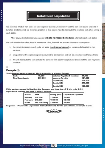 %u062c%u0645%u064a%u0639 %u0627%u0644%u062d%u0642%u0648%u0642 %u0645%u062d%u0641%u0648%u0638%u0629 %u0640 %u0627%u0625%u0644%u0639%u062a%u062f%u0627%u0621 %u0639%u0644%u0649 %u062d%u0642 %u0627%u0644%u0645%u0624%u0644%u0641 93 %u0628%u0627%u0644%u0646%u0633%u062e %u0623%u0648 %u0627%u0644%u0637%u0628%u0627%u0639%u0629 %u064a%u0639%u0631%u0636 %u0641%u0627%u0639%u0644%u0647 %u0644%u0644%u0645%u0633%u0627%u0626%u0644%u0629 %u0627%u0644%u0642%u0627%u0646%u0648%u0646%u064a%u0629We assumed that all non-cash are sold together as whole, however in fact the non-cash assets are sold in batches (installments). So, the main problem in that case is how to distribute the available cash after selling of each batch.After paying the liabilities we prepared a (Safe Payment Schedule) after selling of each batch.the cash distribution takes place in an external table, in which we assume the worst assumptions:1. the remaining assets + cash to be set aside (contingency balance) as losses and allocated to the partners.2. any partner with negative capital is assumed to be insolvent and will be allocated to other partners.3. We will distribute the cash only to the partners with positive capital and the end of the Safe Payment Schedule. %u02c7Example (1)The following Balance Sheet of ABC Partnership is given as follows:Cash 45,000 salaries Payable (5 months) 24,000Non Cash Assets 800,000 account Payable 151,000Capital (A) 264,000Capital (B) 246,000Capital (C) 160,000If the partners agreed to liquidate the Company and they share P & L in ratio 3:2:1. If you know that the non-cash is sold as follows:month cost selling price Liquidation expensesJanuary 200,000 170,000 12,000February 240,000 150,000 18,000Marth The remaining 120,000 42,000Required: Prepare the Liquidation Table (Statement) for the period from January to march.91Installment Liquidation