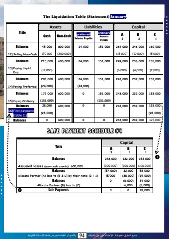 %u062c%u0645%u064a%u0639 %u0627%u0644%u062d%u0642%u0648%u0642 %u0645%u062d%u0641%u0648%u0638%u0629 %u0640 %u0627%u0625%u0644%u0639%u062a%u062f%u0627%u0621 %u0639%u0644%u0649 %u062d%u0642 %u0627%u0644%u0645%u0624%u0644%u0641 94 %u0628%u0627%u0644%u0646%u0633%u062e %u0623%u0648 %u0627%u0644%u0637%u0628%u0627%u0639%u0629 %u064a%u0639%u0631%u0636 %u0641%u0627%u0639%u0644%u0647 %u0644%u0644%u0645%u0633%u0627%u0626%u0644%u0629 %u0627%u0644%u0642%u0627%u0646%u0648%u0646%u064a%u0629The Liquidation Table (Statement) January.TitleAssets Liabilities CapitalCash Non-Cash preferredSalaries PayableordinaryAccounts PayableA 3B 2C 1Balances 45,000 800,000 24,000 151,000 264,000 246,000 160,00012) Selling Non-Cash 170,000 (200,000) (15,000) (10,000) (5,000)Balances 215,000 600,000 24,000 151,000 249,000 236,000 155,00013) Paying Liquid. Exp. (12,000) (6,000) (4,000) (2,000)Balances 203,000 600,000 24,000 151,000 243,000 232,000 153,00014) Paying Preferred (24,000) (24,000)Balances 179,000 600,000 0 151,000 243,000 232,000 153,00015) Paying Ordinary (151,000) (151,000)Balances 28,000 600,000 0 0 243,000 232,000 153,00016)First payment (table (1) (28,000) (28,000)Balances 0 600,000 0 0 243,000 232,000 125,0001TitleCapitalA 3B 2C 1Balances 243,000 232,000 153,000Assumed losses (non-cash assets) 600,000 (300,000) (200,000) (100,000)Balances (57,000) 32,000 53,000Allocate Partner (A) loss to (B & C) by their ratio (2 : 1) 57000 (38,000) (19,000)Balances 0 (6,000) 34,000Allocate Partner (B) loss to (C) 6,000 (6,000)Safe Payments 0 0 28,00092%u2776%u2777
