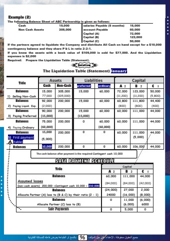 %u062c%u0645%u064a%u0639 %u0627%u0644%u062d%u0642%u0648%u0642 %u0645%u062d%u0641%u0648%u0638%u0629 %u0640 %u0627%u0625%u0644%u0639%u062a%u062f%u0627%u0621 %u0639%u0644%u0649 %u062d%u0642 %u0627%u0644%u0645%u0624%u0644%u0641 96 %u0628%u0627%u0644%u0646%u0633%u062e %u0623%u0648 %u0627%u0644%u0637%u0628%u0627%u0639%u0629 %u064a%u0639%u0631%u0636 %u0641%u0627%u0639%u0644%u0647 %u0644%u0644%u0645%u0633%u0627%u0626%u0644%u0629 %u0627%u0644%u0642%u0627%u0646%u0648%u0646%u064a%u0629Example (2)The following Balance Sheet of ABC Partnership is given as follows:Cash 15,000 salaries Payable (5 months) 15,000Non Cash Assets 305,000 account Payable 60,000Capital (A) 72,000Capital (B) 123,000Capital (C) 50,000If the partners agreed to liquidate the Company and distribute All Cash on hand except for a $10,000 contingency balance and they share P & L in ratio 2:2:1. If you know the assets with a book value of $105,000 is sold for $77,000. And the Liquidation expenses is $2,000 Required: Prepare the Liquidation Table (Statement).The Liquidation Table (Statement) January.Title Assets Liabilities CapitalCash Non-Cash preferred ordinary A 2 B 2 C 1Balances 15,000 305,000 15,000 60,000 72,000 123,000 50,0001) Selling Non-Cash 77,000 (105,000) (11,200) (11,200) (5,800)Balances 92,000 200,000 15,000 60,000 60,800 111,800 44,4002) Paying Liquid. Exp. (2,000) (800) (800) (400)Balances 90,000 200,000 15,000 60,000 60,000 111,000 44,0003) Paying Preferred (15,000) (15,000)Balances 75,000 200,000 0 60,000 60,000 111,000 44,0004) Paying Ordinary (60,000) (60,000)Balances 15,000 200,000 0 0 60,000 111,000 44,0005) First payment (table) (5,000) (5,000)Balances 10,000 200,000 0 0 60,000 106,000 44,000Title CapitalA 2 B 2 C 1Balances 60,000 111,000 44,000Assumed losses(non-cash assets) 200,000 +Contingent cash 10,000 = 210,000(84,000) (84,000) (42,000)Balances (24,000) 27,000 2,000Allocate Partner (A) loss to (B & C) by their ratio (2 : 1) 24000 (16,000) (8,000)Balances 0 11,000 (6,000)Allocate Partner (C) loss to (B) (6,000) 6000Safe Payments 0 5,000 094The cash balance after payment is the required Contingent cash 10,000