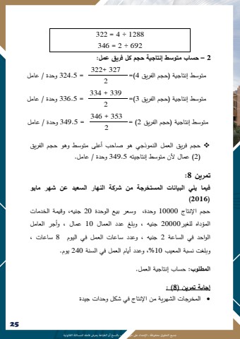 %u062c%u0645%u064a%u0639 %u0627%u0644%u062d%u0642%u0648%u0642 %u0645%u062d%u0641%u0648%u0638%u0629 %u0640 %u0627%u0625%u0644%u0639%u062a%u062f%u0627%u0621 %u0639%u0649%u0644 %u062d%u0642 %u0627%u0645%u0644%u0624%u0644%u0641 %u0628%u0627%u0644%u0646%u0633%u062e %u0623%u0648 %u0627%u0644%u0637%u0628%u0627%u0639%u0629 %u064a%u0639%u0631%u0636 %u0641%u0627%u0639%u0644%u0647 %u0644%u0644%u0645%u0633%u0627%u0626%u0644%u0629 %u0627%u0644%u0642%u0627%u0646%u0648%u0646%u064a%u0629251288 %u00f7 4 = 322692 %u00f7 2 = 3462 %u2013 %u064a%u0633%u0627%u0628 %u0645%u062a%u0648%u0633%u0637 %u0625%u0646%u062a%u0627%u062c%u064a%u0629 %u064a%u062c%u0645 %u0643%u0644 %u0641%u0631%u064a%u0642 %u0639%u0645%u0644:%u0645%u062a%u0648%u0633%u0637 %u0625%u0646%u062a%u0627%u062c%u064a%u0629 )%u062d%u062c%u0645 %u0627%u0644%u0641%u0631%u064a%u0642 4=)327+ 322= 5.324 %u0648%u062d%u062f%u0629 / %u0639%u0627%u0645%u06442%u0645%u062a%u0648%u0633%u0637 %u0625%u0646%u062a%u0627%u062c%u064a%u0629 )%u062d%u062c%u0645 %u0627%u0644%u0641%u0631%u064a%u0642 3=)339 + 334= 5.336 %u0648%u062d%u062f%u0629 / %u0639%u0627%u0645%u06442%u0645%u062a%u0648%u0633%u0637 %u0625%u0646%u062a%u0627%u062c%u064a%u0629 )%u062d%u062c%u0645 %u0627%u0644%u0641%u0631%u064a%u0642 2= )353 + 346= 5.349 %u0648%u062d%u062f%u0629 / %u0639%u0627%u0645%u06442%uf076 %u062d%u062c%u0645 %u0641%u0631%u064a%u0642 %u0627%u0644%u0639%u0645%u0644 %u0627%u0644%u0646%u0645%u0648%u0630%u062c%u064a %u0649%u0648 %u0635%u0627%u062d%u0628 %u0623%u0639%u0645%u0649 %u0645%u062a%u0648%u0633%u0637 %u0648%u0649%u0648 %u062d%u062c%u0645 %u0627%u0644%u0641%u0631%u064a%u0642 )2 )%u0639%u0645%u0627%u0644 %u0623%u0644%u0646 %u0645%u062a%u0648%u0633%u0637 %u0625%u0646%u062a%u0627%u062c%u064a%u062a%u0648 5.349 %u0648%u062d%u062f%u0629 / %u0639%u0627%u0645%u0644.%u062a%u0645%u0631%u064a%u0646 8 :%u0641%u064a%u0645%u0627 %u0645%u064a %u0627%u0644%u062d%u064a%u0627%u0646%u0627%u062a %u0627%u0644%u0645%u0633%u062a%u0631%u0631%u062c%u0629 %u0645%u0646 %u0634%u0631%u0643%u0629 %u0627%u0644%u0646%u0623%u0627%u0631 %u0627%u0644%u0633%u0639 %u062f %u0639%u0646 %u0634%u0623%u0631 %u0645%u0627 %u0648 )2016)%u062d%u062c%u0645 %u0627%u0625%u0644%u0646%u062a%u0627%u062c 10000 %u0648%u062d%u062f%u0629%u060c %u0648%u0633%u0639%u0631 %u0628%u064a%u0639 %u0627%u0644%u0648%u062d%u062f%u0629 20 %u062c%u0646%u064a%u0648%u060c %u0648%u0642%u064a%u0645%u0629 %u0627%u0644%u062e%u062f%u0645%u0627%u062a %u0627%u0644%u0645%u0624%u062f%u0627%u0647 %u0644%u0645%u063a%u064a%u063120000 %u062c%u0646%u064a%u0648 %u060c %u0648%u0628%u0645%u063a %u0639%u062f%u062f %u0627%u0644%u0639%u0645%u0627%u0644 10 %u0639%u0645%u0627%u0644 %u060c %u0648%u0623%u062c%u0631 %u0627%u0644%u0639%u0627%u0645%u0644 %u0627%u0644%u0648%u0627%u062d%u062f %u0641%u064a %u0627%u0644%u0633%u0627%u0639%u0629 2 %u062c%u0646%u064a%u0648 %u060c %u0648%u0639%u062f%u062f %u0633%u0627%u0639%u0627%u062a %u0627%u0644%u0639%u0645%u0644 %u0641%u064a %u0627%u0644%u064a%u0648%u0645 8 %u0633%u0627%u0639%u0627%u062a %u060c %u0648%u0628%u0645%u063a%u062a %u0646%u0633%u0628%u0629 %u0627%u0644%u0645%u0639%u064a%u0628 10 %u060c%%u0648%u0639%u062f%u062f %u0623%u064a%u0627%u0645 %u0627%u0644%u0639%u0645%u0644 %u0641%u064a %u0627%u0644%u0633%u0646%u0629 240 %u064a%u0648%u0645.%u0627%u0644%u0645%u0645%u0645%u0648%u0628: %u062d%u0633%u0627%u0628 %u0625%u0646%u062a%u0627%u062c%u064a%u0629 %u0627%u0644%u0639%u0645%u0644.%u0625%u062c%u0627 %u0629 %u062a%u0645%u0631%u064a%u0646 )8: )%uf0b7 %u0627%u0644%u0645%u062e%u0631%u062c%u0627%u062a %u0627%u0644%u0634%u064a%u0631%u064a%u0629 %u0645%u0646 %u0627%u0625%u0644%u0646%u062a%u0627%u062c %u0641%u064a %u0634%u0643%u0644 %u0648%u062d%u062f%u0627%u062a %u062c%u064a%u062f%u0629