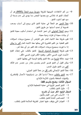 %u062c%u0645%u064a%u0639 %u0627%u0644%u062d%u0642%u0648%u0642 %u0645%u062d%u0641%u0648%u0638%u0629 %u0640 %u0627%u0625%u0644%u0639%u062a%u062f%u0627%u0621 %u0639%u0649%u0644 %u062d%u0642 %u0627%u0645%u0644%u0624%u0644%u0641 %u0628%u0627%u0644%u0646%u0633%u062e %u0623%u0648 %u0627%u0644%u0637%u0628%u0627%u0639%u0629 %u064a%u0639%u0631%u0636 %u0641%u0627%u0639%u0644%u0647 %u0644%u0644%u0645%u0633%u0627%u0626%u0644%u0629 %u0627%u0644%u0642%u0627%u0646%u0648%u0646%u064a%u0629329 -%u0645%u0646 %u0623%u0647%u0645 %u0627%u0627%u0644%u0646%u062a%u0642%u0627%u062f%u0627%u062a %u0627%u0644%u0645%u0648%u062c%u0647%u0629 %u0644%u0637%u0631%u064a%u0642%u0629 %u0645%u062a%u0648%u0633%u0637 %u0645%u0631%u0628%u0639 %u0627%u0644%u062e%u0637%u0623 (MSE (%u0647%u0648 %u0623%u0646 %u0623%u062e%u0637%u0627%u0621 %u0627%u0644%u062a%u0646%u0628%u0624 %u0642%u062f %u062a%u062a%u0627%u0644%u0634%u0649 %u0645%u0639 %u0628%u0639%u0636%u0647%u0627 %u0627%u0644%u0628%u0639%u0636 %u0645%u0645%u0627 %u064a%u0624%u062f%u064a %u0625%u0644%u0649 %u0639%u062f%u0645 %u0635%u062d%u0629 %u0623%u0648 %u0633%u0648%u0621 %u0641%u0647%u0645 %u0623%u0633%u0644%u0648%u0628 %u0627%u0644%u062a%u0646%u0628%u0624. 10 -%u062e%u0637%u0623 %u0627%u0644%u062a%u062d%u064a%u0632 %u0647%u0648 %u0627%u0644%u062e%u0637%u0623 %u0641%u064a %u0639%u0645%u0644%u064a%u0629 %u0627%u0644%u062a%u0646%u0628%u0624 %u0627%u0644%u0630%u064a %u064a%u0631%u062c%u0639 %u0625%u0644%u0649 %u0623%u0633%u0628%u0627%u0628 %u064a%u0635%u0639%u0628 %u062a%u0641%u0633%u064a%u0631%u0647%u0627 %u0623%u0648 %u062a%u062d%u062f%u064a%u062f %u0623%u0633%u0628%u0627%u0628%u0647%u0627 %u0639%u0646 %u0637%u0631%u064a%u0642 %u0627%u0644%u062a%u0646%u0628%u0624. 11 -%u064a%u0631%u062c%u0639 %u0627%u0644%u062e%u0637%u0623 %u0627%u0644%u0639%u0634%u0648%u0627%u0626%u064a %u0625%u0644%u0649 %u062a%u062d%u064a%u0632 %u0627%u0644%u0628%u0627%u062d%u062b %u0641%u064a %u0627%u0633%u062a%u062e%u062f%u0627%u0645 %u0623%u0633%u0627%u0644%u064a%u0628 %u0645%u0639%u064a%u0646%u0629 %u0644%u0644%u062a%u0646%u0628%u0624 %u0623%u0648 %u0628%u064a%u0627%u0646%u0627%u062a %u0645%u0639%u064a%u0646%u0629 %u0623%u0648 %u0641%u062a%u0631%u0627%u062a %u0632%u0645%u0646%u064a%u0629 %u0645%u0639%u064a%u0646%u0629.12 -%u062a%u0642%u0648%u0645 %u0637%u0631%u064a%u0642%u0629 %u062e%u0637 %u0627%u0627%u0644%u062a%u062c%u0627%u0647 %u0627%u0644%u0639%u0627%u0645 %u0639%u0644%u0649 %u0627%u0641%u062a%u0631%u0627%u0636 %u0623%u0646 %u0645%u062c%u0645%u0648%u0639 %u0645%u0631%u0628%u0639%u0627%u062a %u0627%u0646%u062d%u0631%u0627%u0641%u0627%u062a %u0627%u0644%u0642%u064a%u0645 %u0627%u0644%u0641%u0639%u0644%u064a%u0629 %u0639%u0646 %u0627%u0644%u0642%u064a%u0645 %u0627%u0644%u062a%u0642%u062f%u064a%u0631%u064a%u0629 %u0627%u0644%u062a%u064a %u064a%u0645%u062b%u0644%u0647%u0627 %u062e%u0637 %u0627%u0627%u0644%u062a%u062c%u0627%u0647 %u0627%u0644%u0639%u0627%u0645 %u0623%u0643%u0628%u0631 %u0645%u0627 %u064a%u0645%u0643%u0646 %u0625%u0630%u0627 %u0645%u0627 %u0642%u0648%u0631%u0646%u062a %u0628%u0645%u062c%u0645%u0648%u0639 %u0645%u0631%u0628%u0639%u0627%u062a %u0627%u0646%u062d%u0631%u0627%u0641%u0627%u062a %u062a%u0644%u0643 %u0627%u0644%u0642%u064a%u0645 %u0639%u0646 %u0623%u064a %u062e%u0637 %u0622%u062e%u0631.13 -%u062a%u0642%u0648%u0645 %u0637%u0631%u064a%u0642%u0629 %u0627%u0644%u0645%u062a%u0648%u0633%u0637 %u0627%u0644%u0645%u062a%u062d%u0631%u0643 %u0627%u0644%u0628%u0633%u064a%u0637 %u0644%u0644%u062a%u0646%u0628%u0624 %u0628%u0627%u0644%u0637%u0644%u0628 %u0639%u0644%u064a %u0625%u0639%u0637%u0627%u0621 %u0627%u0644%u0641%u062a%u0631%u0629 %u0627%u0623%u0644%u062d%u062f%u062b %u0627%u0644%u0648%u0632%u0646 %u0627%u0644%u0646%u0633%u0628%u064a %u0627%u0623%u0644%u0643%u0628%u0631%u060c %u0648%u0627%u0644%u0641%u062a%u0631%u0629 %u0627%u0623%u0644%u0642%u062f%u0645 %u0627%u0644%u0648%u0632%u0646 %u0627%u0644%u0646%u0633%u0628%u064a %u0627%u0623%u0644%u0642%u0644.14 -%u062a%u0648%u062c%u062f %u0639%u0627%u0644%u0642%u0629 %u0637%u0631%u062f%u064a%u0629 %u0628%u064a%u0646 %u062f%u0642%u0629 %u0627%u0644%u062a%u0646%u0628%u0624 %u0648%u0627%u0644%u0641%u062a%u0631%u0629 %u0627%u0644%u0632%u0645%u0646%u064a%u0629 %u0627%u0644%u062a%u064a %u064a%u063a%u0637%u064a%u0647%u0627 %u0627%u0644%u062a%u0646%u0628%u0624.15 -%u064a%u0645%u0643%u0646 %u0627%u0644%u0642%u0648%u0644 %u0623%u0646 %u0627%u0644%u062a%u0646%u0628%u0624 %u0642%u0635%u064a%u0631 %u0627%u0644%u0645%u062f%u0649 %u064a%u062a%u0636%u0645%u0646 %u0645%u0642%u062f%u0627%u0631 %u0645%u0646 %u0639%u0646%u0635%u0631 %u0639%u062f%u0645 %u0627%u0644%u062a%u0623%u0643%u062f %u0623%u0643%u0628%u0631 %u0645%u0646 %u0627%u0644%u062a%u0646%u0628%u0624 %u0637%u0648%u064a%u0644 %u0627%u0644%u0645%u062f%u0649.16 -%u062e%u0637%u0623 %u0627%u0644%u062a%u0646%u0628%u0624 %u0627%u0625%u0644%u062c%u0645%u0627%u0644%u064a %u064a%u0643%u0648%u0646 %u0623%u0642%u0644 %u0645%u0646 %u062e%u0637%u0623 %u0627%u0644%u062a%u0646%u0628%u0624 %u0627%u0644%u062c%u0632%u0626%u064a. %u064b %u0644%u0643%u0644 %u0645%u0646 %u0625%u0633%u062a %u0627%u0631%u062a%u064a%u062c%u064a%u0629 %u0627%u0623%u0644%u0639%u0645%u0627%u0644 )%u0627%u0644%u062a%u0646%u0627%u0641%u0633(%u060c%u064b %u0623%u0633%u0627%u0633%u064a%u062717 -%u064a%u0639%u062f %u0627%u0644%u062a%u0646%u0628%u0624 %u0628%u0627%u0644%u0637%u0644%u0628 %u0645%u062f%u062e%u0627%u0644%u0648%u0627%u0644%u062a%u0646%u0628%u0624%u0627%u062a %u0627%u0644%u0645%u062a%u0639%u0644%u0642%u0629 %u0628%u0627%u0644%u0645%u0648%u0627%u0631%u062f %u0627%u0644%u0627%u0644%u0632%u0645%u0629 %u0644%u0625%u0644%u0646%u062a%u0627%u062c. %u0627%u0644%u0633%u0624%u0627%u0644 %u0627%u0644%u062b%u0627%u0644%u062b: %u0648%u0636 %u0627%u0644%u0631%u0633%u0628 %u0641%u0642%u0637: 1 -%u0627%u0644%u062a%u0646%u0628%u0624 %u0643%u062d%u062c%u0631 %u0644%u0644%u0632%u0627%u0648%u064a%u0629 %u0641%u064a %u0639%u0645%u0644%u064a%u0629 %u0627%u0644%u062a%u062e%u0637%u064a%u0637 %u0644%u0625%u0644%u0646%u062a%u0627%u062c. 2 -%u0637%u0631%u0642 %u0627%u