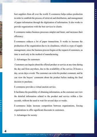 %u062c%u0645%u064a%u0639 %u0627%u0644%u062d%u0642%u0648%u0642 %u0645%u062d%u0641%u0648%u0638%u0629 %u0640 %u0627%u0625%u0644%u0639%u062a%u062f%u0627%u0621 %u0639%u0649%u0644 %u062d%u0642 %u0627%u0645%u0644%u0624%u0644%u0641 %u0628%u0627%u0644%u0646%u0633%u062e %u0623%u0648 %u0627%u0644%u0637%u0628%u0627%u0639%u0629 %u064a%u0639%u0631%u0636 %u0641%u0627%u0639%u0644%u0647 %u0644%u0644%u0645%u0633%u0627%u0626%u0644%u0629 %u0627%u0644%u0642%u0627%u0646%u0648%u0646%u064a%u062944best suppliers from all over the world. E-commerce helps reduce production in order to establish the process of retrieval and distribution, and management of paper information through the digitization of information. It also works to provide organizations with the best services to clients. E-commerce makes business processes simpler and faster, and increases their efficiency. E-commerce reduces a lot of paper transactions. It works to increase the production of the organization due to its cloudiness, which is a type of supply management, since the business process begins at the request of customers, as time is used only in the method of manufacturing. 2- Advantages for customers Customers can inquire about the offered product or service at any time during the day and from anywhere, due to the availability of the service 24 hours a day, seven days a week. The customer can write his product comment, and he can view the buyers%u2019 comments about the product before making the final decision to purchase. E-commerce provides a virtual auction service. It facilitates the possibility of obtaining information, as the customer can view the detailed information related to the product and service within a few seconds, without the need to wait for several days or weeks. E-commerce helps increase competition between organizations, forcing organizations to offer significant discounts to customers. 3- Advantages for society