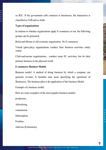 %u062c%u0645%u064a%u0639 %u0627%u0644%u062d%u0642%u0648%u0642 %u0645%u062d%u0641%u0648%u0638%u0629 %u0640 %u0627%u0625%u0644%u0639%u062a%u062f%u0627%u0621 %u0639%u0649%u0644 %u062d%u0642 %u0627%u0645%u0644%u0624%u0644%u0641 %u0628%u0627%u0644%u0646%u0633%u062e %u0623%u0648 %u0627%u0644%u0637%u0628%u0627%u0639%u0629 %u064a%u0639%u0631%u0636 %u0641%u0627%u0639%u0644%u0647 %u0644%u0644%u0645%u0633%u0627%u0626%u0644%u0629 %u0627%u0644%u0642%u0627%u0646%u0648%u0646%u064a%u062977as B2C. If the government sells contracts to businesses, the transaction is classified as G2B and so forth. Types of organizations In relation to whether organizations apply E-commerce or not, the following groups can be generated. Brick and Mortar or old economy organization. No E-commerce Virtual (pure-play) organizations conduct their business activities solely online Click-and-mortar organizations . conduct some EC activities, but do their primary business in the physical world E-commerce Business Models Business model: A method of doing business by which a company can generate revenue. It Includes nine areas specifying the operations of Businesses. The business plan is the application of the business Model. Example of a business model: Here are some examples of the most popular business models: production. Advertising. commission. Subscription. Freebies. Add-ons (Extensions).