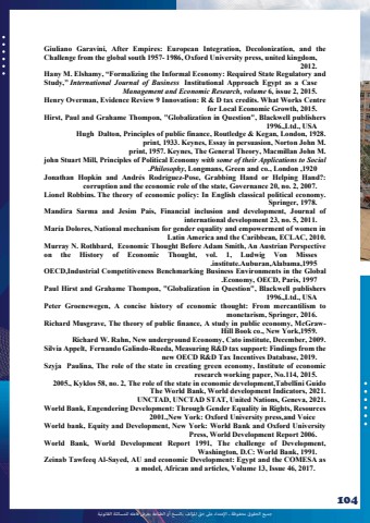 %u062c%u0645%u064a%u0639 %u0627%u0644%u062d%u0642%u0648%u0642 %u0645%u062d%u0641%u0648%u0638%u0629 %u0640 %u0627%u0625%u0644%u0639%u062a%u062f%u0627%u0621 %u0639%u0649%u0644 %u062d%u0642 %u0627%u0645%u0644%u0624%u0644%u0641 %u0628%u0627%u0644%u0646%u0633%u062e %u0623%u0648 %u0627%u0644%u0637%u0628%u0627%u0639%u0629 %u064a%u0639%u0631%u0636 %u0641%u0627%u0639%u0644%u0647 %u0644%u0644%u0645%u0633%u0627%u0626%u0644%u0629 %u0627%u0644%u0642%u0627%u0646%u0648%u0646%u064a%u0629104 104 the and, Decolonization, Integration European: Empires After, Garavini Giuliano ,kingdom united, press University Oxford, 1986- 1957 south global the from Challenge.2012 and Regulatory State Required: Economy Informal the Formalizing, %u201cElshamy. M HanyCase a as Egypt Approach Institutional Business of Journal International,%u201d Study.2015, 2 issue, 6 volume, Research Economic and Management Centre Works What. credits tax D & R: Innovation 9 Review Evidence, Overman Henry.2015, Growth Economic Local for publishers Blackwell\, Question in Globalization, \Thompon Grahame and Paul, HirstUSA., Ltd.,1996.1928, London, Kegan & Routledge, finance public of Principles, Dalton Hugh.M John Norton, persuasion in Essay, Keynes. 1933, print.M John Macmillan, Theory General The, Keynes. 1957, print Social to Applications their of some with Economy Political of Principles, Mill Stuart john1920 ,London., co and Green, Longmans, Philosophy. :?Hand Helping or Hand Grabbing, Pose%u2010Rodr%u00edguez Andr%u00e9s and Hopkin Jonathan.2007, 2. no, 20 Governance, state the of role economic the and corruption .economy political classical English In: policy economic of theory The. Robbins Lionel.1978, Springer of Journal, development and inclusion Financial, Pais Jesim and Sarma Mandira.2011, 5. no, 23 development international in women of empowerment and equality gender for mechanism National, Dolores Mar%u00eda.2010, ECLAC, Caribbean the and America Latin Perspective Austrian An, Smith Adam Before Thought Economic, Rothbard. N Murray Misses Von Ludwig, 1. vol, Thought Economic of History the on1995,Alabama,Auburan.institute . Global the in Environments Business Benchmarking Competitiveness Industrial,OECD1997, Paris, OECD, Economy. publishers Blackwell\, Question in Globalization, \Thompon Grahame and Hirst PaulUSA., Ltd.,1996 to mercantilism From: thought economic of history concise A, Groenewegen Peter.2016, Springer, monetarism.1959,York New., co Book Hill,McGraw, economy public in study A, finance public of theory The, Musgrave Richard.2009, December, institute Cato, Economy underground New, Rahn. W Richard the from Findings: support tax D&R Measuring, Rueda-Galindo Fernando, Appelt Silvia.2019, Database Incentives Tax D&R OECD new economic of Institute, economy green creating in state the of role The, Paulina Szyja.2015, 114.No, paper working researchGuido Tabellini,development economic in state the of role The, 2. no, 58 Kyklos., 2005.2021, Indicators development World, Bank World The.2021, Geneva, Nations United, STAT UNCTAD, UNCTAD Resources, Rights in Equality Gender Through: Development Engendering, Bank World Voice and,press University Oxford: York New.,2001 University Oxford and Bank World: York New, Development and Equity, bank World.2006 Report Development World, Press ,Development of challenge The, 1991 Report Development World, Bank World.1991, Bank World: C.D, Washington as COMESA the and Egypt: Development economic and AU, Sayed-Al Tawfeeq Zeinab .2017, 46 Issue, 13 Volume, articles and African, model a