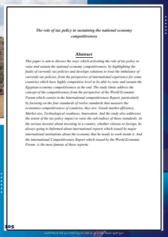 %u062c%u0645%u064a%u0639 %u0627%u0644%u062d%u0642%u0648%u0642 %u0645%u062d%u0641%u0648%u0638%u0629 %u0640 %u0627%u0625%u0644%u0639%u062a%u062f%u0627%u0621 %u0639%u0649%u0644 %u062d%u0642 %u0627%u0645%u0644%u0624%u0644%u0641 %u0628%u0627%u0644%u0646%u0633%u062e %u0623%u0648 %u0627%u0644%u0637%u0628%u0627%u0639%u0629 %u064a%u0639%u0631%u0636 %u0641%u0627%u0639%u0644%u0647 %u0644%u0644%u0645%u0633%u0627%u0626%u0644%u0629 %u0627%u0644%u0642%u0627%u0646%u0648%u0646%u064a%u0629 205205 economy national the sustaining in policy tax of role ThecompetitivenessAbstract to policy tax of role the activating which ways the discuss to aim is paper This the highlighting by, competitiveness economy national the sustain and raise of imbalance the treat to solutions develops and policies tax currently of faults some for experience international of perspective the from, policies tax currently the sustain and raise to able be to level competitive highly have which countries the address limits study The. end the at competitiveness economy Egyptian Economic World the of perspective the from competitiveness the of concept particularly, Report competitiveness International the in consist which Forum the measure that standards twelve of standards four the on focusing by ,efficiency market Goods: are they, countries of competitiveness economies addresses also study the And. Innovation, readiness Technological, size Market As. standards those of indices-sub the raise to impact policy tax the of extent the he, foreign or citizens whether, country a in investing about investor serious the major by issued which reports international about Informed to going always And. it inside work to needs he that economy the about institutions international Economic World the by issued which Report Competitiveness international the.reports these of famous most the is Forum