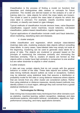 %u062c%u0645%u064a%u0639 %u0627%u0644%u062d%u0642%u0648%u0642 %u0645%u062d%u0641%u0648%u0638%u0629 %u0640 %u0627%u0625%u0644%u0639%u062a%u062f%u0627%u0621 %u0639%u0649%u0644 %u062d%u0642 %u0627%u0645%u0644%u0624%u0644%u0641 %u0628%u0627%u0644%u0646%u0633%u062e %u0623%u0648 %u0627%u0644%u0637%u0628%u0627%u0639%u0629 %u064a%u0639%u0631%u0636 %u0641%u0627%u0639%u0644%u0647 %u0644%u0644%u0645%u0633%u0627%u0626%u0644%u0629 %u0627%u0644%u0642%u0627%u0646%u0648%u0646%u064a%u062910Classification is the process of finding a model (or function) that describes and distinguishes data classes or concepts for future prediction. The models are derived based on the analysis of a set of training data (i.e., data objects for which the class labels are known). The model is used to predict the class label of objects for which the class label is unknown. For example, classify countries based on (climate), or classify cars based on (gas mileage). Typical methods of classification include decision trees, na%u00efve Bayesian classification, support vector machines, neural networks, rule-based classification, pattern-based classification, logistic regression. Typical applications of classification include credit card fraud detection, direct marketing, classifying stars and diseases. 4. cluster analysis Unlike classification and regression, which analyze class-labeled (training) data sets, clustering analyzes data objects without consulting class labels. In many cases, class-labeled data may simply not exist at the beginning. Clustering can be used to generate class labels for a group of data. The objects are clustered or grouped based on the principle of maximizing the intraclass similarity and minimizing the interclass similarity. That is, clusters of objects are formed so that objects within a cluster have high similarity in comparison to one another but are rather dissimilar to objects in other clusters. 5.outlier analysis A data set may contain objects that do not comply with the general behavior or model of the data. These data objects are outliers. Many data mining methods discard outliers as noise or exceptions. Outliers may be detected using statistical tests that assume a distribution or probability model for the data or using distance measures where objects that are remote from any other cluster are considered outliers. Rather than using statistical or distance measures, density-based methods may identify outliers in a local region, although they look normal from a global statistical distribution view. V. Technologies for MiningData mining has incorporated many techniques from other domains such as statistics, machine learning, pattern recognition, database and data warehouse systems, information retrieval, visualization, algorithms, highperformance computing, and many applications domains.