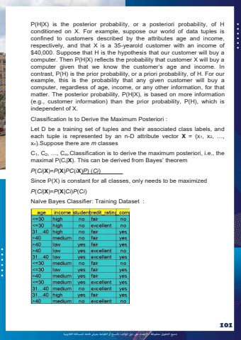 %u062c%u0645%u064a%u0639 %u0627%u0644%u062d%u0642%u0648%u0642 %u0645%u062d%u0641%u0648%u0638%u0629 %u0640 %u0627%u0625%u0644%u0639%u062a%u062f%u0627%u0621 %u0639%u0649%u0644 %u062d%u0642 %u0627%u0645%u0644%u0624%u0644%u0641 %u0628%u0627%u0644%u0646%u0633%u062e %u0623%u0648 %u0627%u0644%u0637%u0628%u0627%u0639%u0629 %u064a%u0639%u0631%u0636 %u0641%u0627%u0639%u0644%u0647 %u0644%u0644%u0645%u0633%u0627%u0626%u0644%u0629 %u0627%u0644%u0642%u0627%u0646%u0648%u0646%u064a%u0629101P(H|X) is the posterior probability, or a posteriori probability, of H conditioned on X. For example, suppose our world of data tuples is confined to customers described by the attributes age and income, respectively, and that X is a 35-yearold customer with an income of $40,000. Suppose that H is the hypothesis that our customer will buy a computer. Then P(H|X) reflects the probability that customer X will buy a computer given that we know the customer%u2019s age and income. In contrast, P(H) is the prior probability, or a priori probability, of H. For our example, this is the probability that any given customer will buy a computer, regardless of age, income, or any other information, for that matter. The posterior probability, P(H|X), is based on more information (e.g., customer information) than the prior probability, P(H), which is independent of X. Classification Is to Derive the Maximum Posteriori : Let D be a training set of tuples and their associated class labels, and each tuple is represented by an n-D attribute vector X = (x1, x2, %u2026, xn).Suppose there are m classes C1, C2, %u2026, Cm.Classification is to derive the maximum posteriori, i.e., the maximal P(Ci|X). This can be derived from Bayes%u2019 theorem P(Ci|X)=P(X|PC(iX)P) (Ci) Since P(X) is constant for all classes, only needs to be maximized P(Ci|X)=P(X|Ci)P(Ci) Na%u00efve Bayes Classifier: Training Dataset :