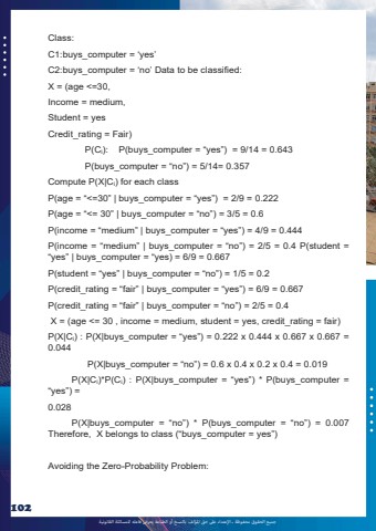 %u062c%u0645%u064a%u0639 %u0627%u0644%u062d%u0642%u0648%u0642 %u0645%u062d%u0641%u0648%u0638%u0629 %u0640 %u0627%u0625%u0644%u0639%u062a%u062f%u0627%u0621 %u0639%u0649%u0644 %u062d%u0642 %u0627%u0645%u0644%u0624%u0644%u0641 %u0628%u0627%u0644%u0646%u0633%u062e %u0623%u0648 %u0627%u0644%u0637%u0628%u0627%u0639%u0629 %u064a%u0639%u0631%u0636 %u0641%u0627%u0639%u0644%u0647 %u0644%u0644%u0645%u0633%u0627%u0626%u0644%u0629 %u0627%u0644%u0642%u0627%u0646%u0648%u0646%u064a%u0629102Class: C1:buys_computer = %u2018yes%u2019 C2:buys_computer = %u2018no%u2019 Data to be classified: X = (age <=30, Income = medium, Student = yes Credit_rating = Fair) P(Ci): P(buys_computer = %u201cyes%u201d) = 9/14 = 0.643 P(buys_computer = %u201cno%u201d) = 5/14= 0.357 Compute P(X|Ci) for each class P(age = %u201c<=30%u201d | buys_computer = %u201cyes%u201d) = 2/9 = 0.222 P(age = %u201c<= 30%u201d | buys_computer = %u201cno%u201d) = 3/5 = 0.6 P(income = %u201cmedium%u201d | buys_computer = %u201cyes%u201d) = 4/9 = 0.444 P(income = %u201cmedium%u201d | buys_computer = %u201cno%u201d) = 2/5 = 0.4 P(student = %u201cyes%u201d | buys_computer = %u201cyes) = 6/9 = 0.667 P(student = %u201cyes%u201d | buys_computer = %u201cno%u201d) = 1/5 = 0.2 P(credit_rating = %u201cfair%u201d | buys_computer = %u201cyes%u201d) = 6/9 = 0.667 P(credit_rating = %u201cfair%u201d | buys_computer = %u201cno%u201d) = 2/5 = 0.4 X = (age <= 30 , income = medium, student = yes, credit_rating = fair) P(X|Ci) : P(X|buys_computer = %u201cyes%u201d) = 0.222 x 0.444 x 0.667 x 0.667 = 0.044 P(X|buys_computer = %u201cno%u201d) = 0.6 x 0.4 x 0.2 x 0.4 = 0.019 P(X|Ci)*P(Ci) : P(X|buys_computer = %u201cyes%u201d) * P(buys_computer = %u201cyes%u201d) = 0.028 P(X|buys_computer = %u201cno%u201d) * P(buys_computer = %u201cno%u201d) = 0.007 Therefore, X belongs to class (%u201cbuys_computer = yes%u201d) Avoiding the Zero-Probability Problem: